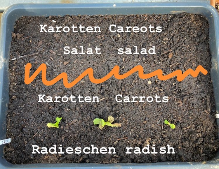 Im großen Hochbeet habe ich bereits Spargelsalat, Rübchen und Beete eingesät. In das kleine Hochbeet erst einmal nur eine Reihe Asia Salat. Die Samen hiervon habe ich im letzten Jahr fleißig gesammelt, er ist einfach so lecker. Die Erfahrung hat gezeigt, dass er hier bereits jetzt gut wächst. Später wird es zu warm im Balkongarten und er geht sofort in die Blüte.