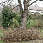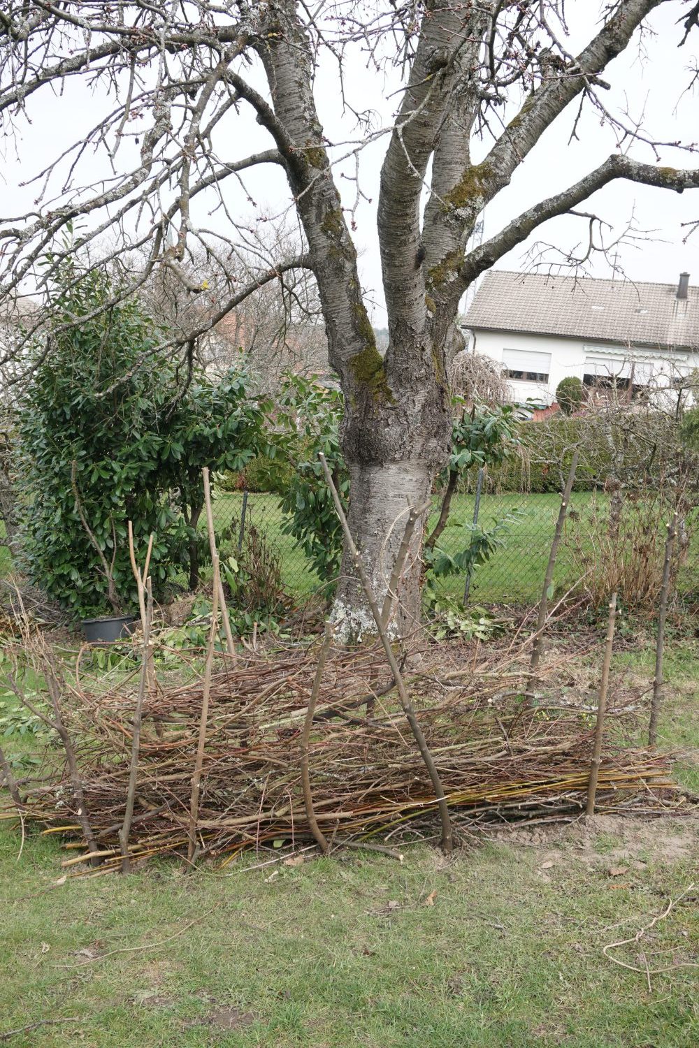 In den nächsten Wochen sammelt sich einiges an an Ästen und Zweigen. Noch ist Platz für weitere Zweige, es liegt ja genug herum, was aufgeschichtet werden muss. Das Schnittgut sackt im Laufe des Jahres ab. Dann kann im nächsten Frühjahr wieder Schnittgut oben auf gelegt werden. Alle drei bis vier Jahre müssen die Stützpfähle ausgetauscht werden, damit die Hecke stabil bleibt.