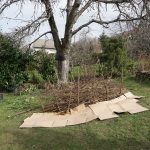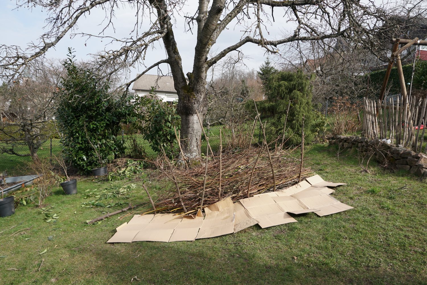 Ich möchte Benjes Hecke und die Wiese dahinter noch um ein Blumenbeet vor der Hecke ergänzen. Dazu lege ich mehrere Lagen an dickem Pappkarton vor der Hecke aus. Denn ich will das Blumenbeet Natur- und Rückenschonend nach der „No Dig“ Methode anlegen. Zur Diskussion Pappe „Ja oder Nein“: Ich verwende nur unbedruckte Pappe, aber ja, die kommt bei mir in den Garten.