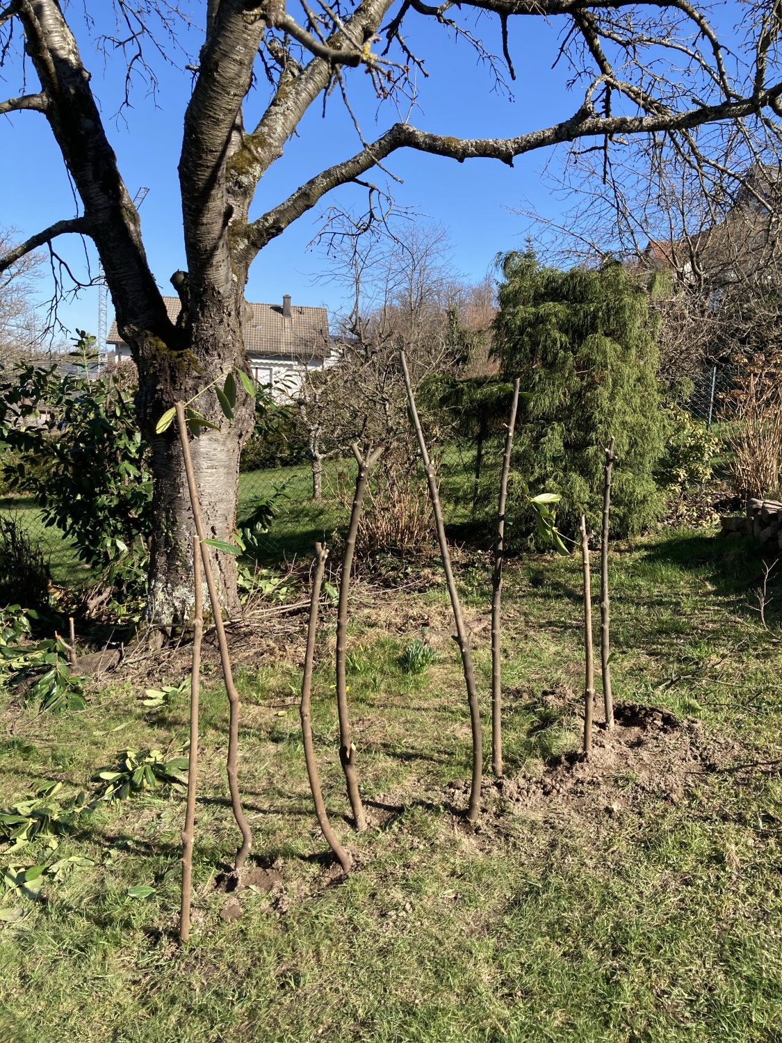 Den Anfang macht die Benjes Hecke. Das ist eine Hecke, welche aus Schnittgut von Bäumen und Sträucher aufgeschichtet wird. Schnittgut sammelt sich jedes zeitige Frühjahr bei mir mehr als genug im Hausgarten an. Alle Obstbäume, die Weide, der Weinstock, der Perückenstrauch und Mehr müssen geschnitten werden. Von den Kirschlorbeerbüschen behalte ich nur die dicken Äste. Sie werden die Stützpfähle – das Grundgerüst – für die Hecke. Dafür spitze ich den unteren Teil der zukünftigen Stützpfäle an, bevor ich sie in die Erde ramme. Der Rest vom Kirschlorbeer wird abtransportiert.
