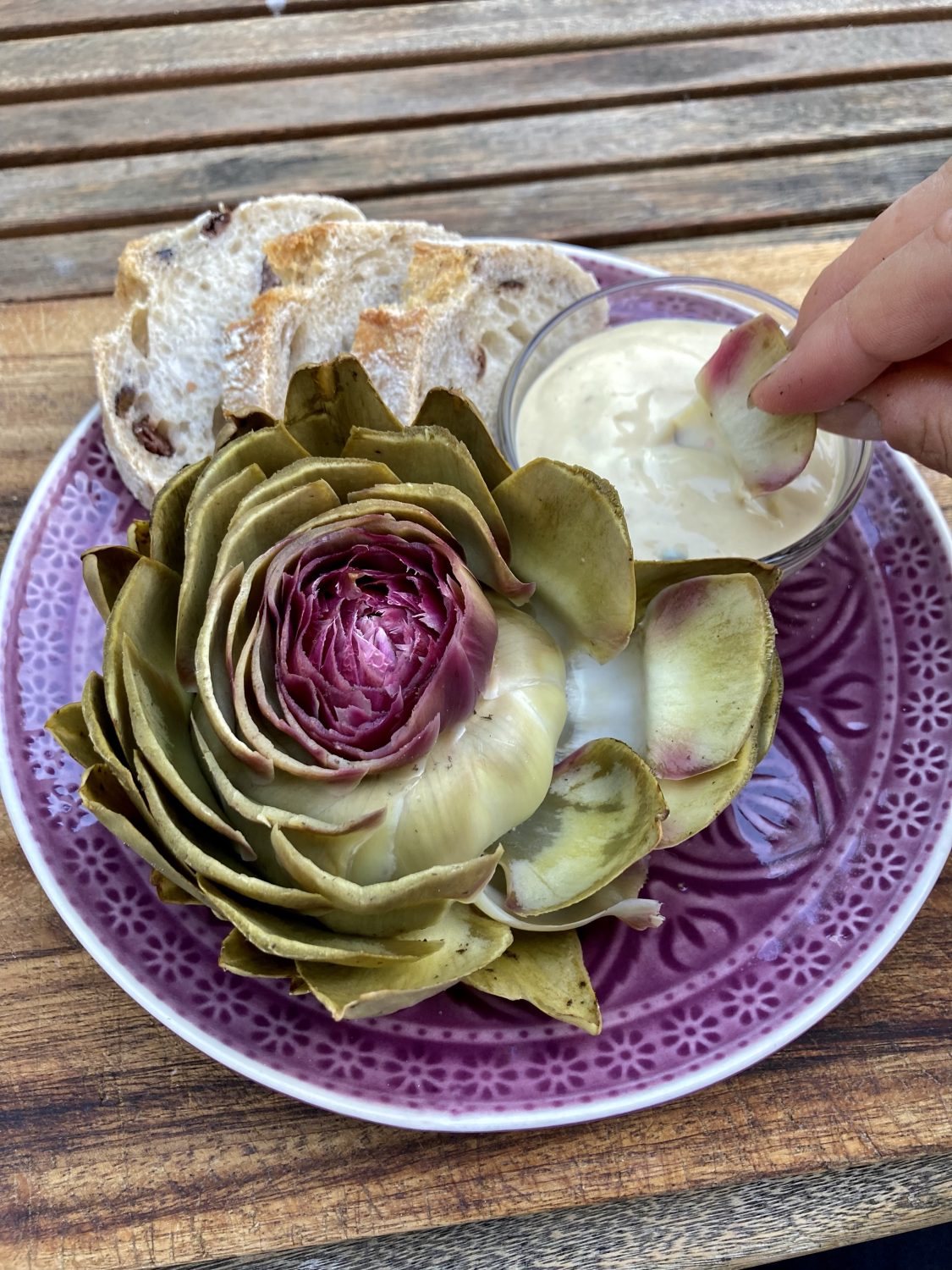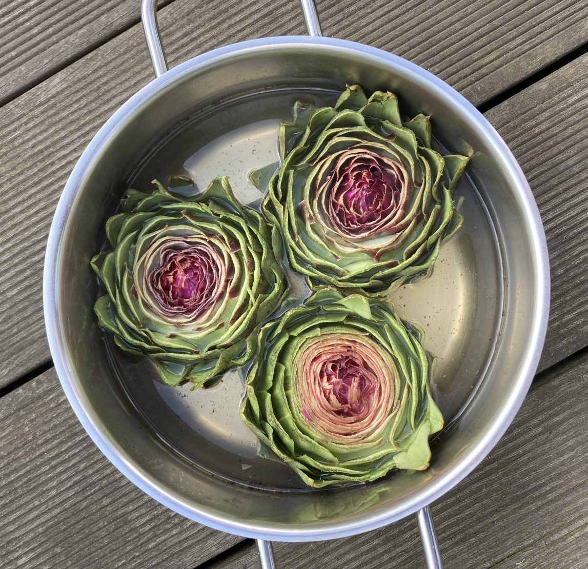 Die Artischocken Knospen werden von den äusseren Blätter befreit, dann wir die Knospenspitze abgeschnitten. Die gesäuberte Knospen kommen dann in heißes Wasser mit Salz und Essig! Essig ist wichtig, damit sich der Geschmack besser heraus bildet und die Farben nicht oxidieren. Normalerweise wird eine Hollondaise dazu gereicht. Mir reicht geklärte Butter.