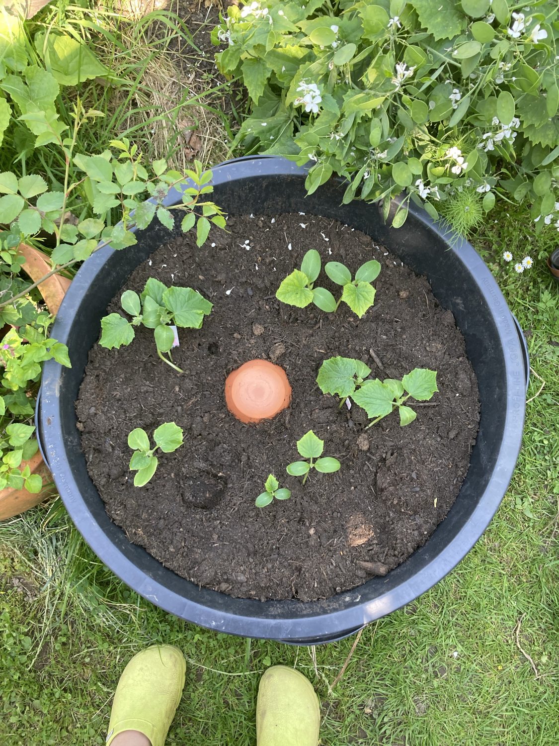 Jetzt wird aber erst einmal der Pflanzkübel bepflanzt. Vier verschiedene Gurken Sorten pflanze ich rund um eine Olla. Die Olla soll für eine kontinuierliche Wasserzufuhr sorgen. In unserem heißen Südgarten ganz wichtig. Denn Gurken reagieren besonders empfindlich auf selbst kurze Trockenphasen. Im maximalem Abstand von 20 cm sitzen jetzt auf 3 / 6 / 9 und 12 Uhr je eine