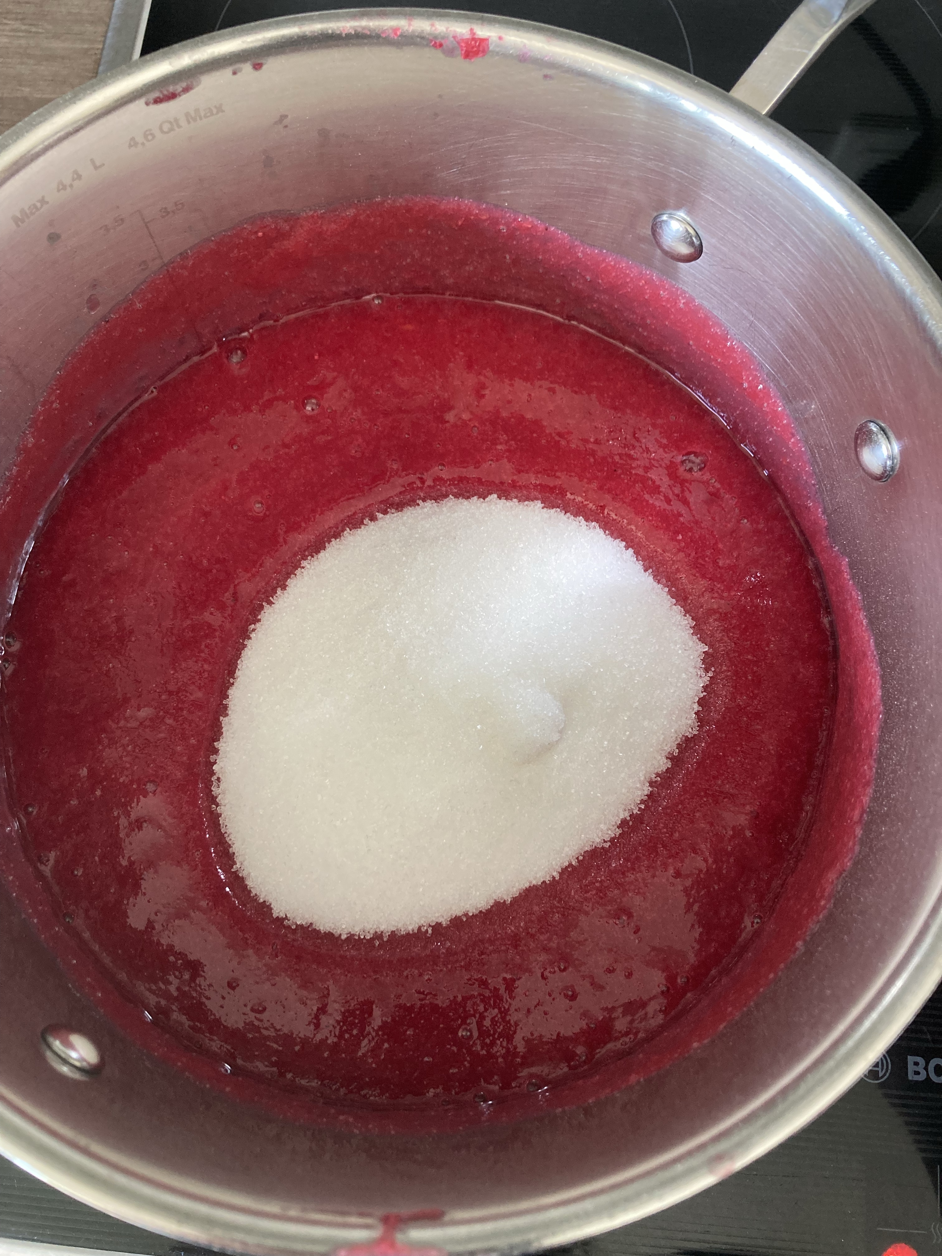 Wenden wir uns den schönen Seiten der Johannisbeeren zu. „Ausgangsprodukt“ für alle weiter Arbeitsschritte ist bei mir der Johannisbeersaft. Dazu die Beeren von den grünen Zweigen abzupfen und kurz aufkochen. Dann Saft und Beeren durch ein Sieb passieren. Passieren heißt durch einen feinmaschigen Sieb reiben. So werden die Häute, etwaige Verunreinigungen, aber vor allem die Kernchen entfernt. Das Ergebnis ist ein sämiger Saft, mit hohem Fruchtfleischanteil. Mit den Jostabeeren und Himbeeren verfahre ich genauso.