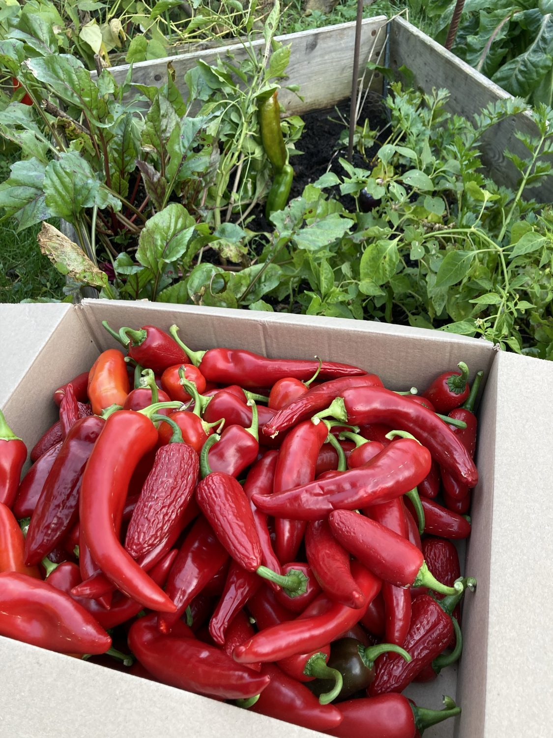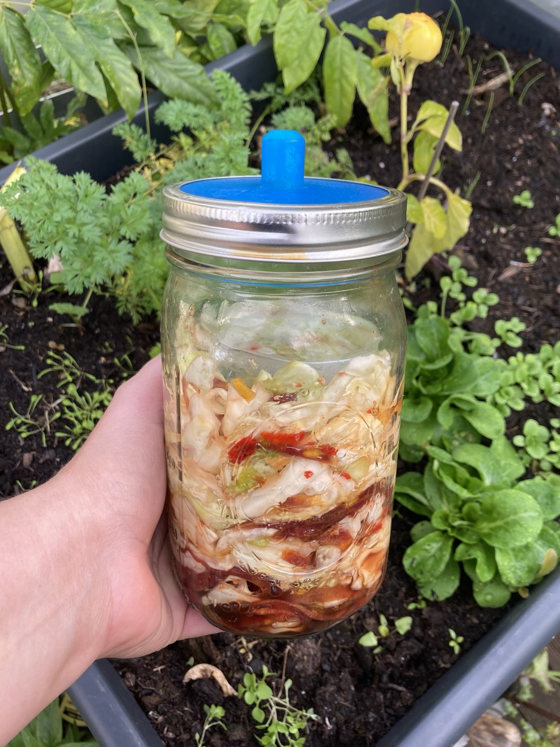 Aber für ein anderes, sehr berühmtes Fermentiertes Gericht finden sich fast alle Zutaten in unserem Gemüsegarten. Kohl, Paprika, Knoblauch und Karotten sind jetzt im September wieder reif. Sogar ein Spitzkohl hat die Attacken des Kohlweißling überlebt. Im Originalrezept wird Chinakohl verwendet. Aber der ist zum Einen noch beliebter bei den Fraßschädlingen und zum Anderen bin ich überhaupt kein Fan davon. Mir werden die Blätter zu weich – „lätschig“ wie wir es nennen – nachdem er fermentiert ist.