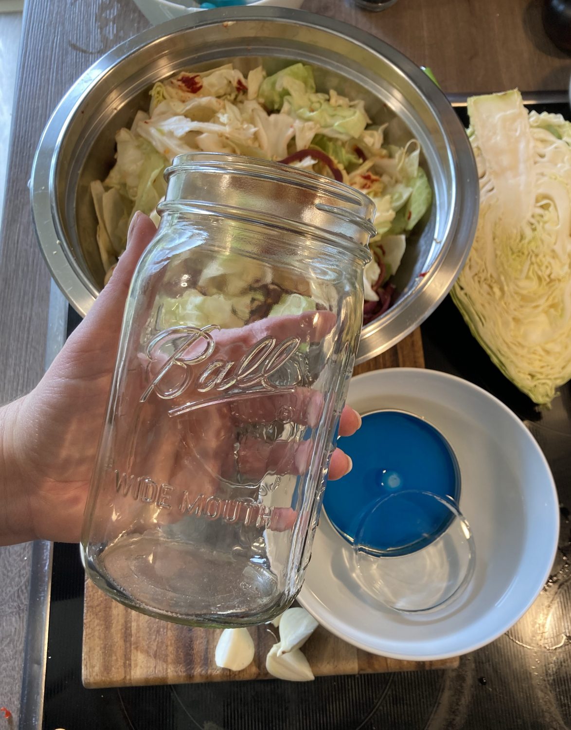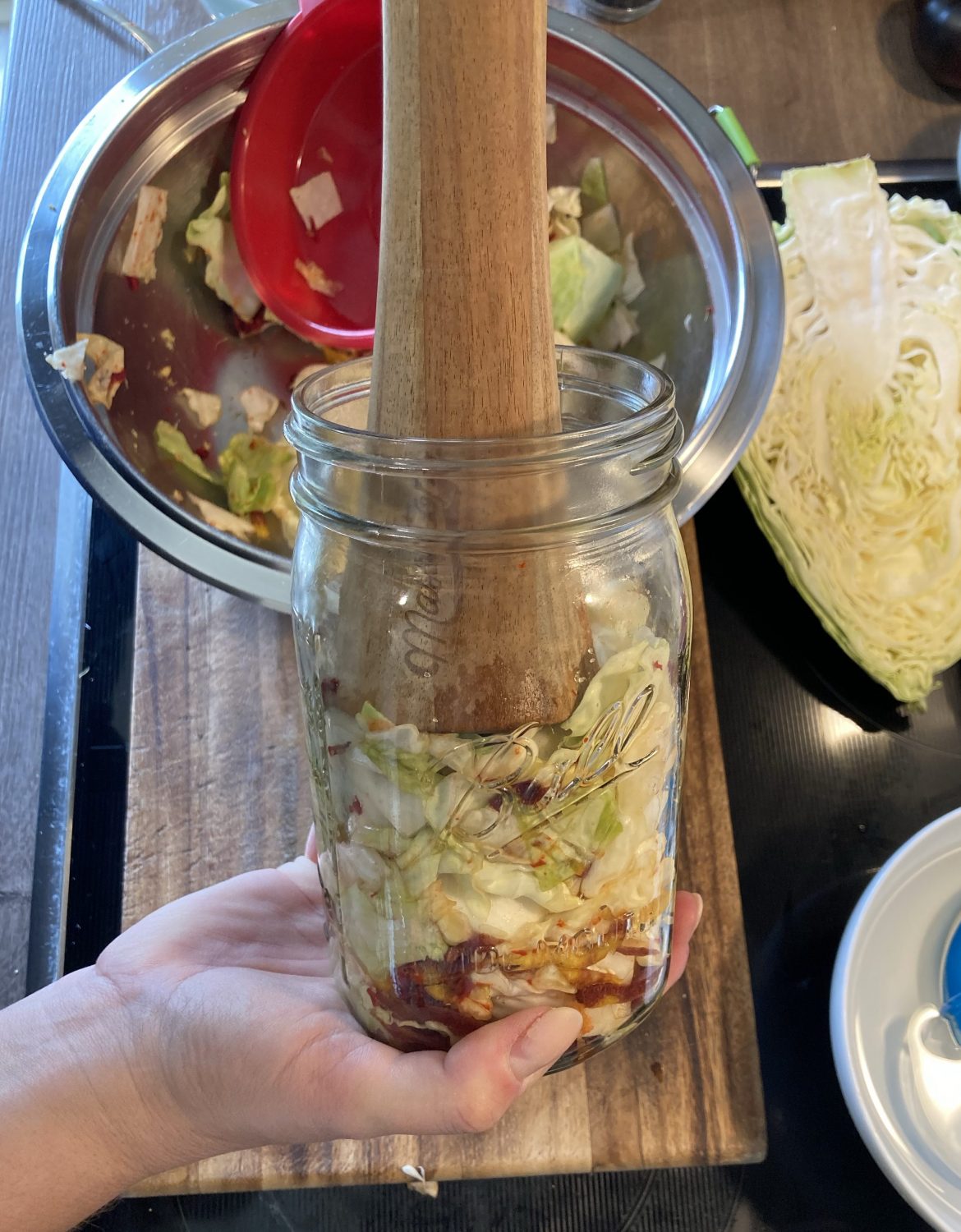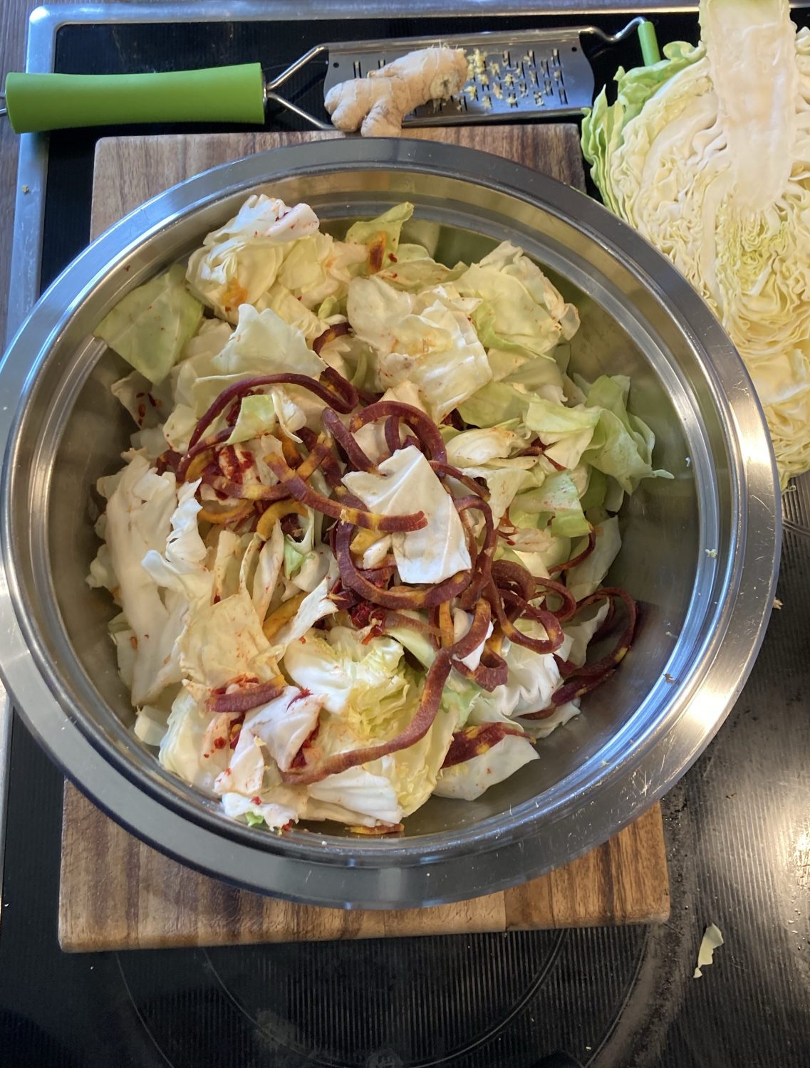 - Jetzt gemischt und gut durchgeknetet, damit die Zellen aufbrechen und der Saft austreten kann. Ich mische in der Schüssel Kohl, Paprika, geriebenem Ingwer, Paprikapulver und Meersalz. Chili, Knoblauch und Fischsauce gebe ich direkt ins Einmachglas. So ist alles gleichmäßig verteilt.Aber natürlich kann auch alles gleich zusammen durchgeknetet und später in die Einmachgläser gegeben werden.