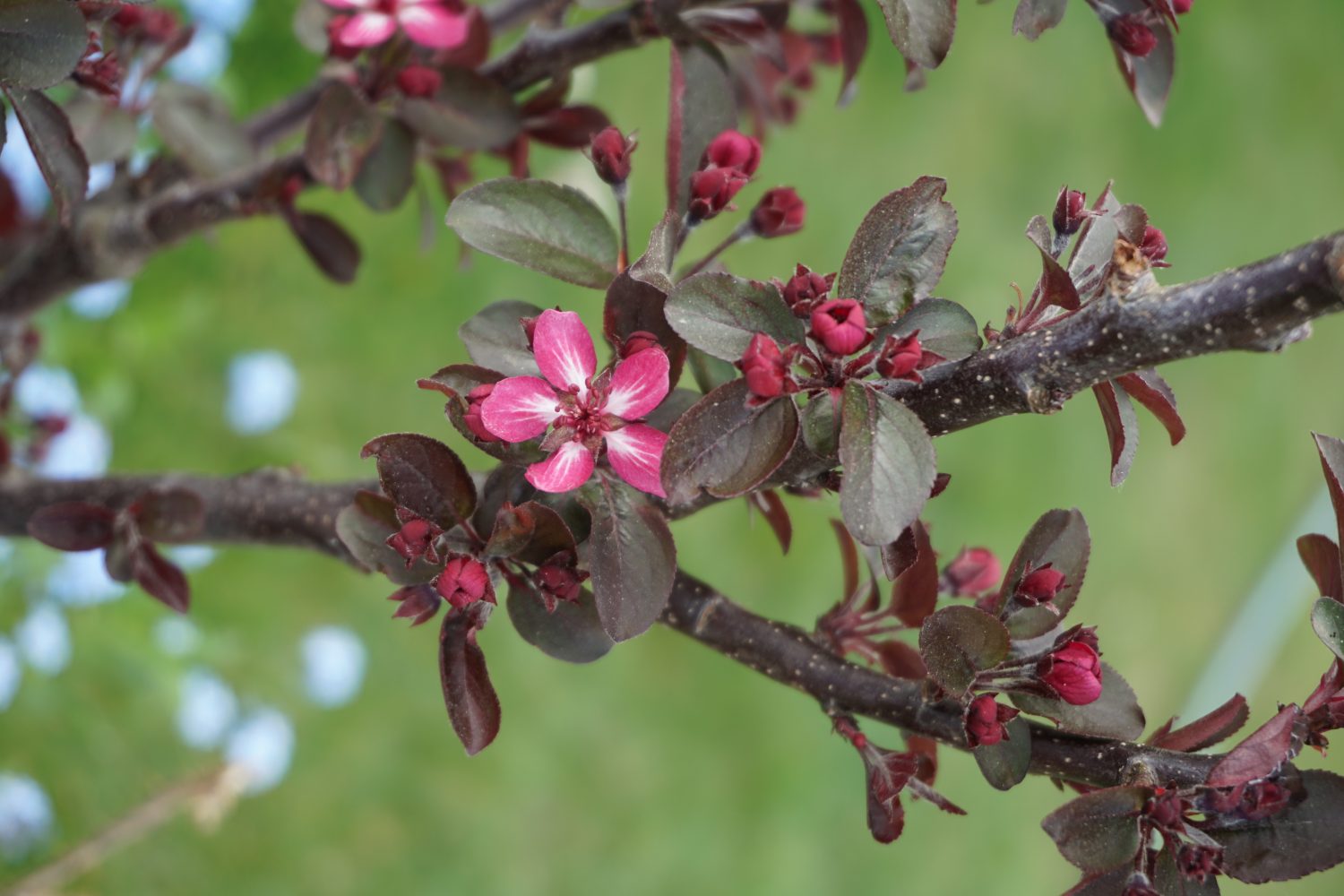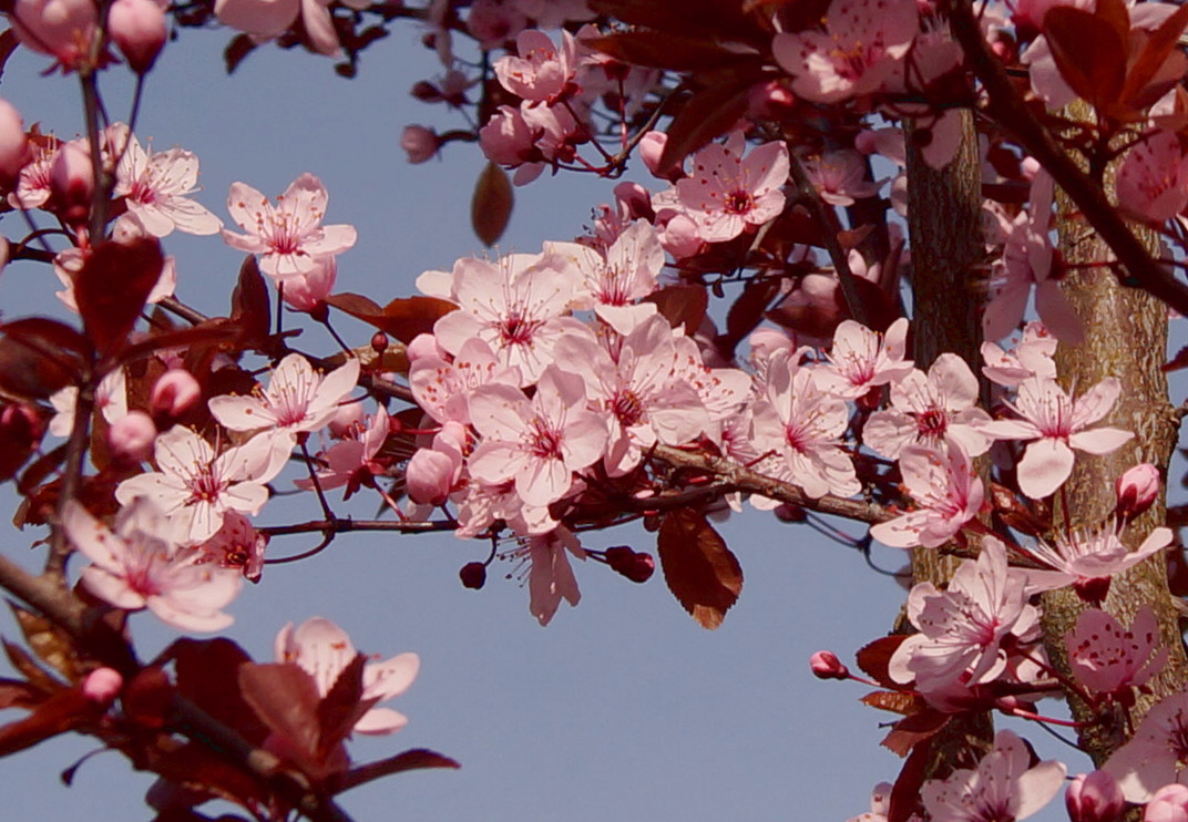 Bei der Auswahl der anderen Laubbäumen war mir eine besondere Struktur und die etwas andere Blattfarbe wichtig. Daher sind alle meine hinzu gekauften Laubbäume mehr oder minder Rot bis Dunkelpurpur in der Blattfärbung. Sie brechen das grüne Einerlei der Kirschlorbeer Büschen auf, welche immer noch viel zu häufig hier im Garten vertreten sind.
