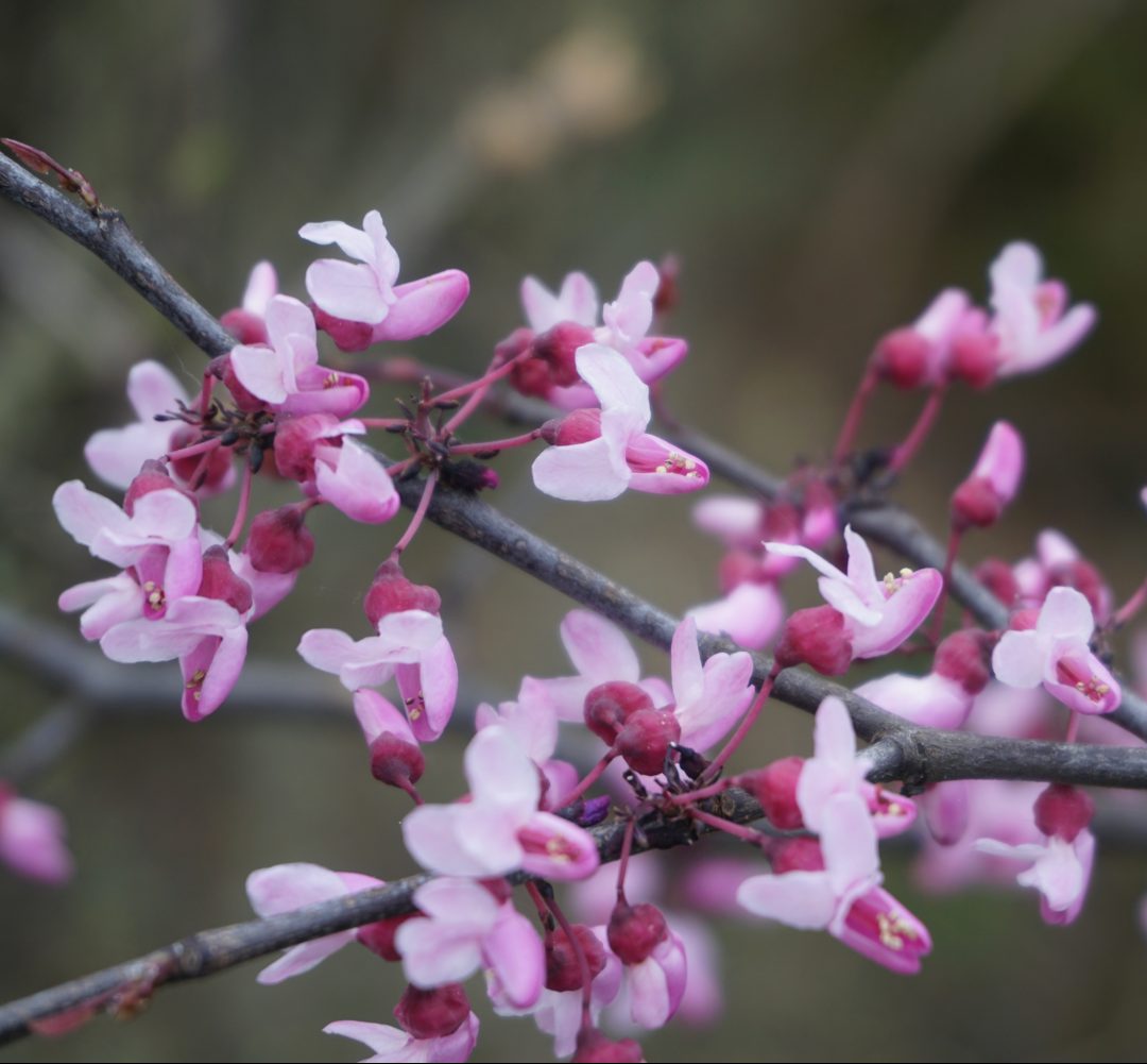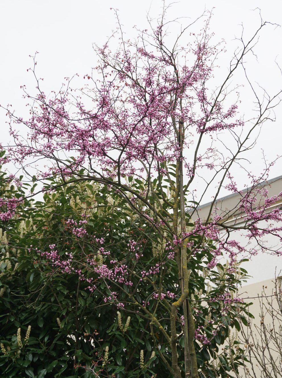 Im nächsten Frühjahr dann eine noch schönere Überraschung. Nicht nur dass der Judasbaum viel früher austrieb – war ja auch ein warmes Frühjahr ohne drohenden Nachfrösten. Er war auch auf einmal voll mit kleinen, purpurnen Blüten. Wie winzige Orchideen sehen die Blüten aus. Und die duften (ich schwärme gerade). Ich konnte mich nicht satt sehen an dieser zarten Pracht. Klar, frau hätte sich vorher darüber informieren können. Aber nachdem ich gelesen hatte, dass diese Baumart mit dem wärmer werdenden Klima gut zurecht kommt, war der Kauf entschieden. Der Judasbaum stammt wie der Perückenstrauch aus der Mittelmeerregion.