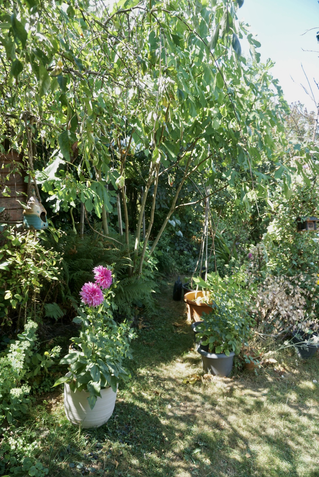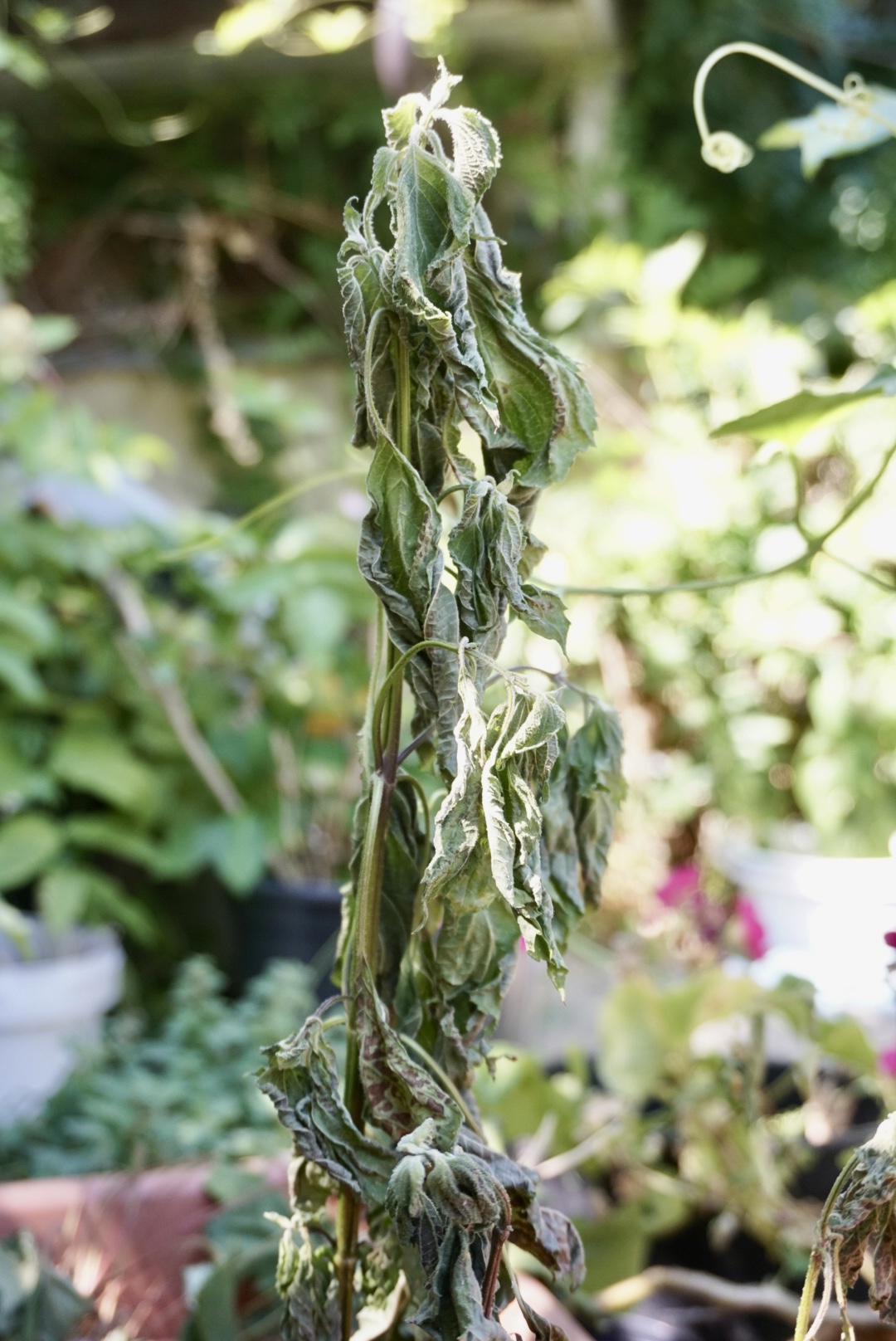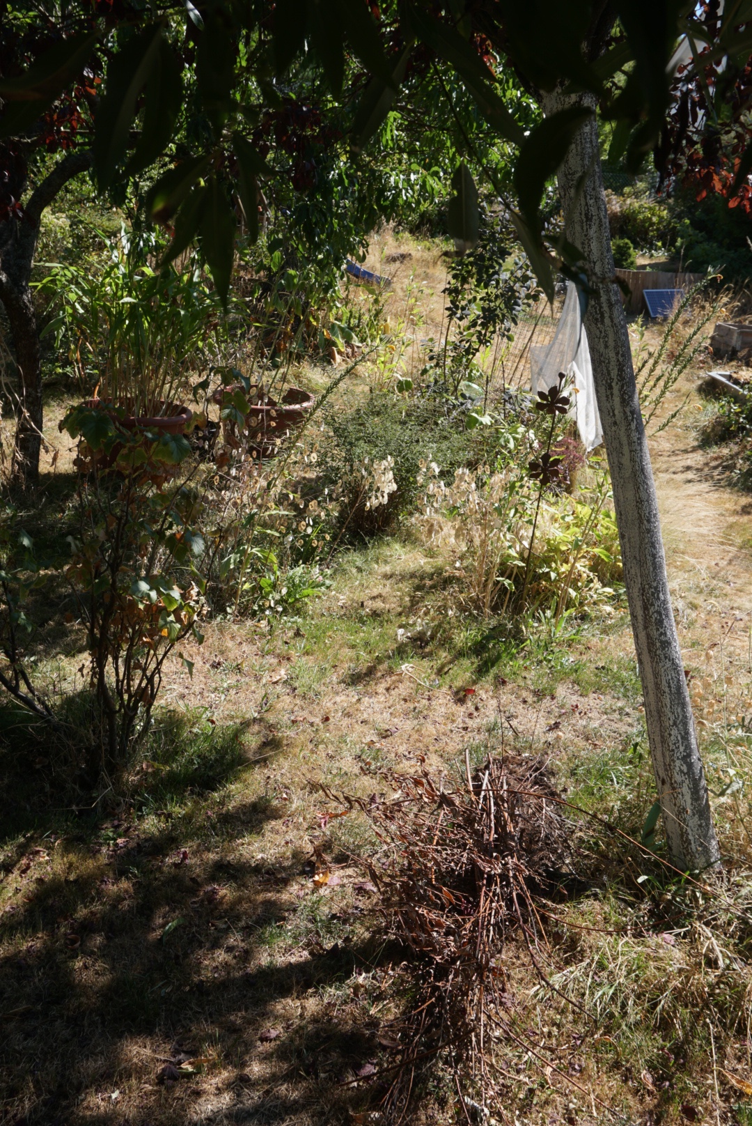 Bei unserem Einzug ins Haus war die Terrasse an der Küche noch vollkommen ohne Schatten. Im Sommer konnte man nicht über die Terrasse gehen, die Füße brannten. Hier kann keine Topfpflanze überleben. Inzwischen ist die Terrasse von drei Seiten abgeschattet durch einen wuchernden Blauregen, dem Bambus und einer schnell wachsenden Weide. Nur im Westen ist kein Schatten. Hier trocknen denn auch regelmäßig die Töpfe innerhalb von Stunden aus.