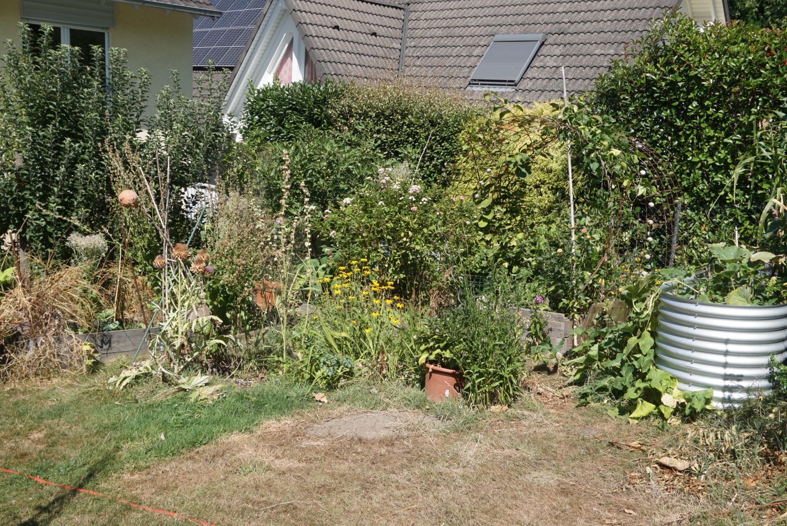 Für die nächsten Hitzesommer muss ich mich noch weiter rüsten. Im oberen, sehr trockenen Gartenteil müssen unbedingt mehr Bäume und Sträucher einziehen. Weitere Dachflächen müssen mit Regentanks bestückt werden. Und noch mehr Gemüse wird eingemacht. Mein Stichwort, es stehen schon wieder 20 kg Tomaten herum.
