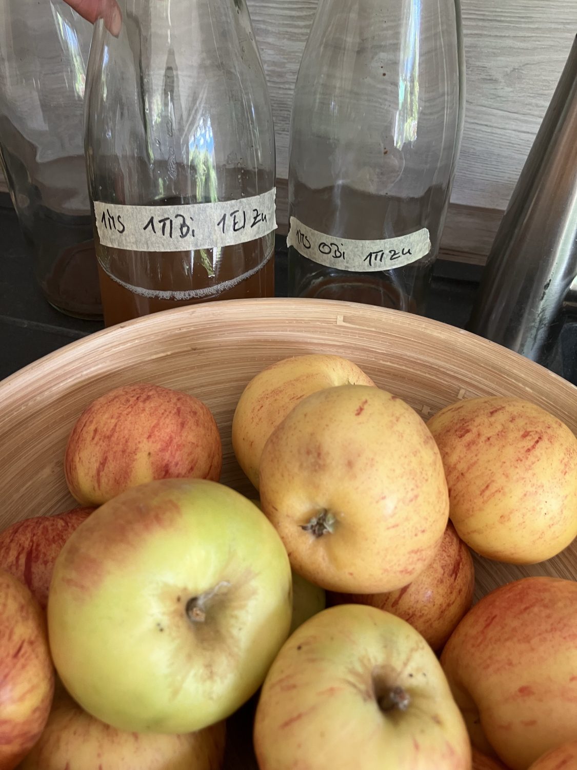 Wer nichts riskieren will, sollte den Apfelsaft kurz auf 70 °C erhitzten. Damit wird dann aber die Naturhefe zerstört. Es muss die Weinhefe zugesetzt werde. Das habe ich bisher bei Pflückobst nicht gemacht. Aber vielleicht werde ich das in Zukunft auch machen. Zumindest bei einem Teil des Apfelsaftes.