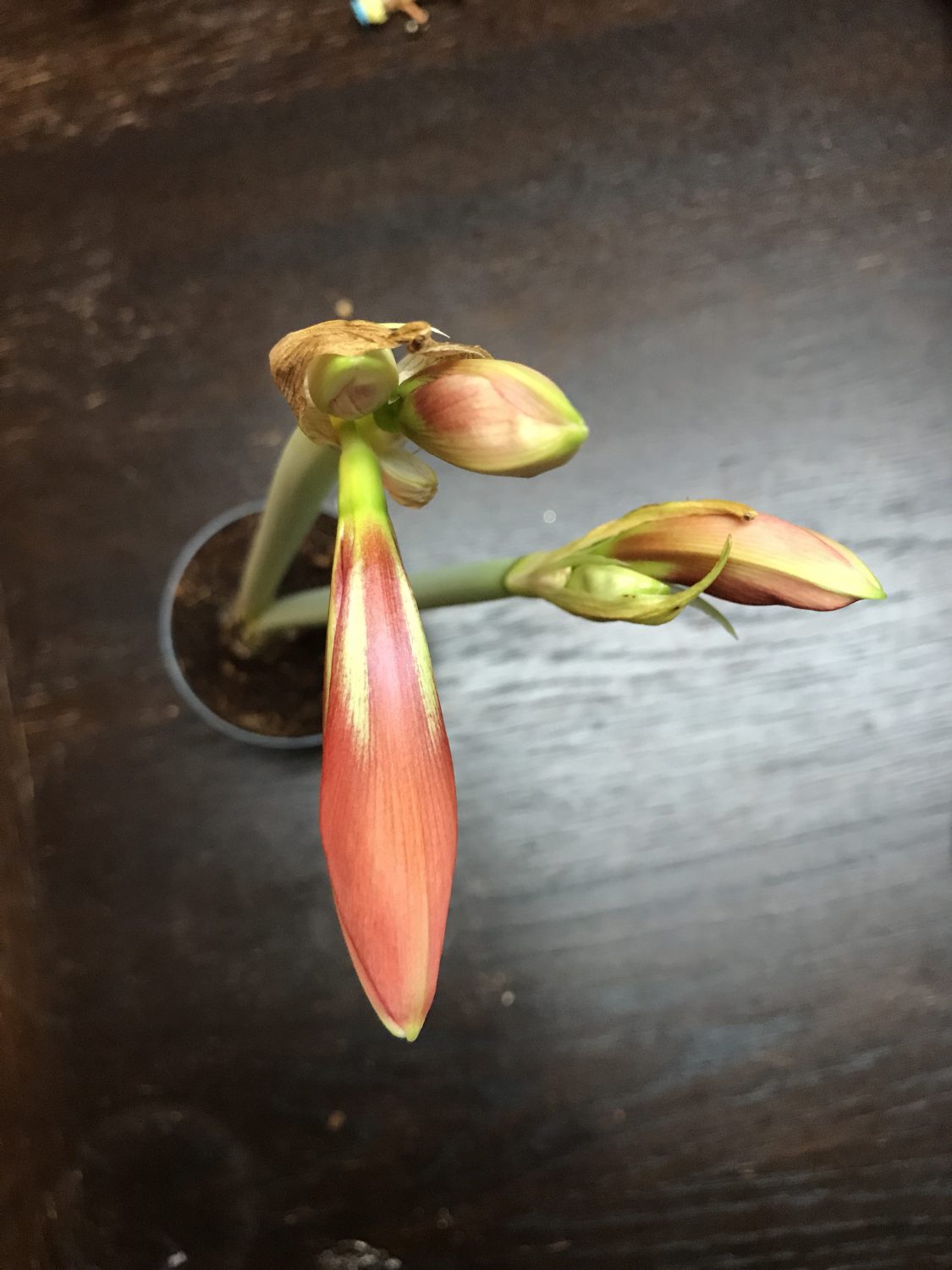 Nach der Blüte – spätestens Anfang Februar – werden die Zwiebeln getopft, wenn sie nicht bereits in einem Pflanztopf sitzen. Eine Zimmerpflanzenerde eignet sich am Besten. Ich lasse dabei das obere Drittel der Zwiebel über der Erde. So können die Blätter weiter wachsen. Verwelkte Blätter bzw. den verwelkten Blütenstängel entfernen. Nur wenig wässern, damit die Zwiebel nicht anfängt zu gammeln.