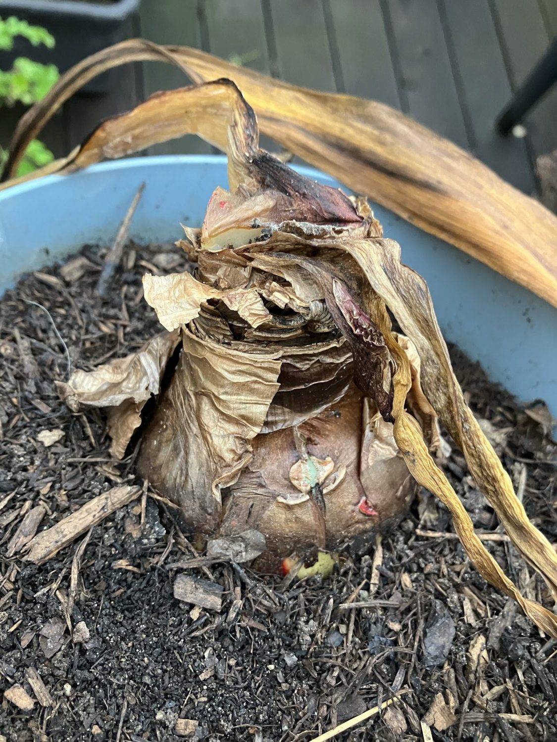 Bevor die Amaryllis Zwiebeln wieder Blüten treiben, brauchen sie eine Ruhephase. Meine Zwiebeln sind Anfang September in eine dunkle Ecke im Schopf umgezogen. In dieser Phase werden die Zwiebeln nicht gegossen. Die Blätter trocknen ab, die ganze Pflanzenkraft ist wieder zurück in die Zwiebel gekehrt. Das ist der gleiche Prozess wie bei Tulpen im Frühsommer. Soll die Zwiebel erhalten bleiben, muss ihr immer die Zeit gegeben werden sich zu erholen.