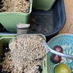 Die winzigen Samen lege ich in rund 1 cm tiefe Löcher. Darüber ein Esslöffel Vermiculit. Das geblähte Tonmineral ist super leicht und kann sehr gut Feuchtigkeit speichern. Die zarten Setzlinge können sich fast mühelos durch die Vermiculit Schicht hindurch schieben. Aber Achtung: Vermiculit trocknet auch sehr schnell aus und kann dann die Setzlinge absterben lassen. Regelmäßig gießen und immer eine Haube darüber lassen. Einen großen Vorteil hat Vermiculit: Es hält die lästigen Trauermückle fern. Es hat also Vor- und Nachteile.
