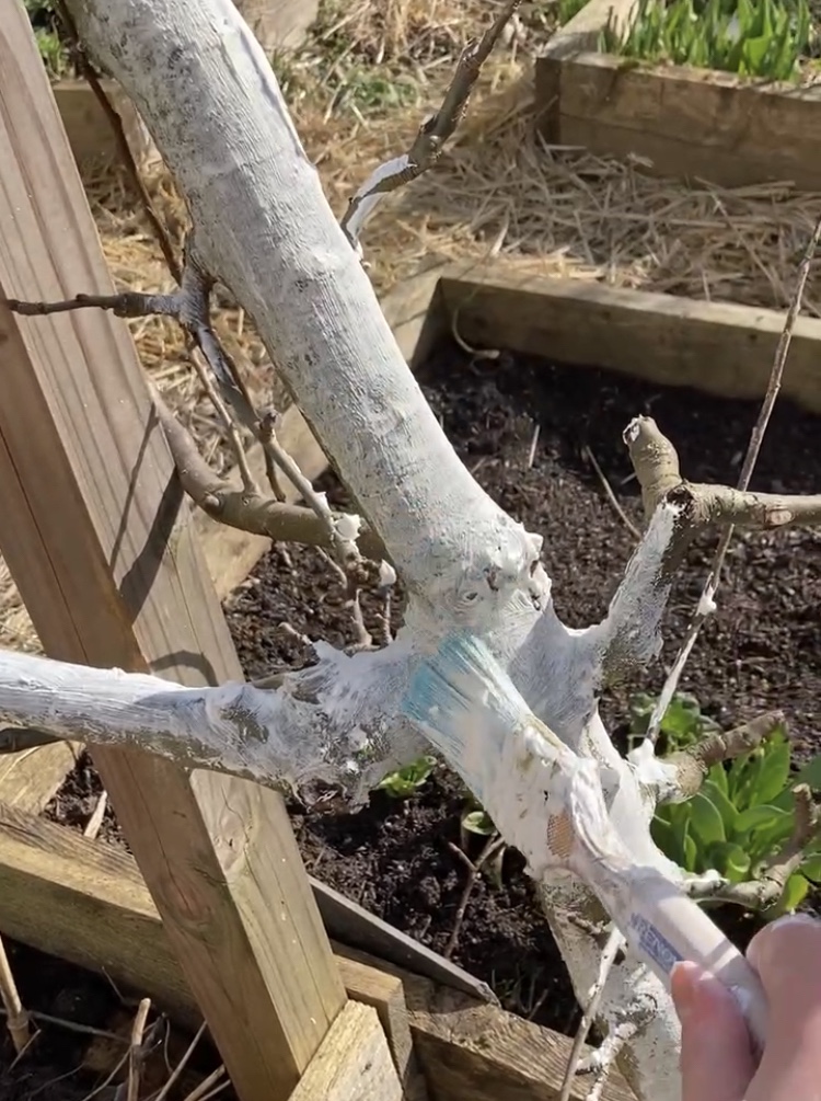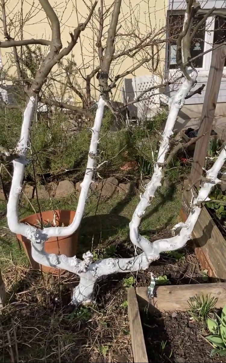 Der Weißanstrich aus Kalk ist ein Schutz vor Frostschäden. Er verhindert, dass bei Sonnenschein die steigenden Baumsäfte im Frühjahr ungleichmäßig auf auftauen. Bei nicht geweißelten Bäumen taut die Sonnenseite des Baumstammes schneller auf – es entstehen Spannungsrisse bis tief in den Baumstamm hinein. Eintrittswunden für Baumkrankheiten und Pilze. Zusätzlich düngt die Kalkfarbe und es sieht auch gut aus.