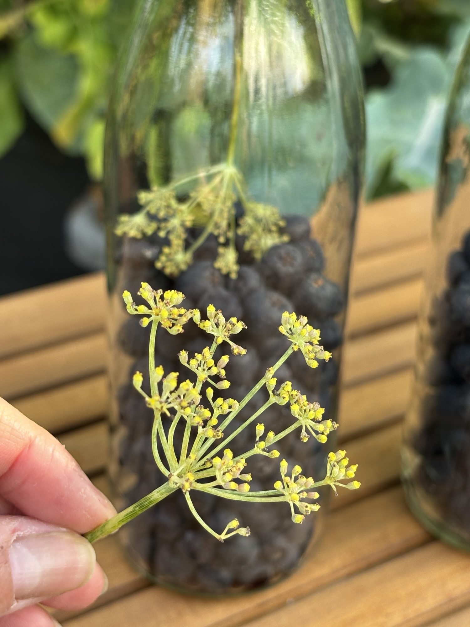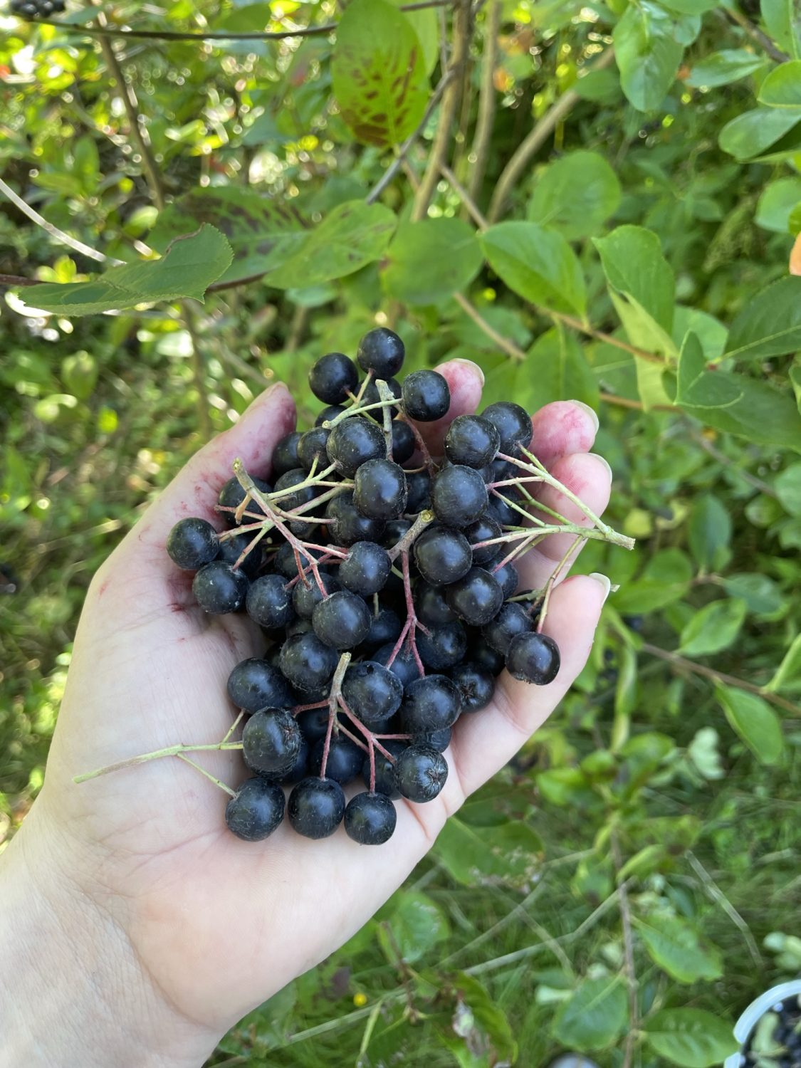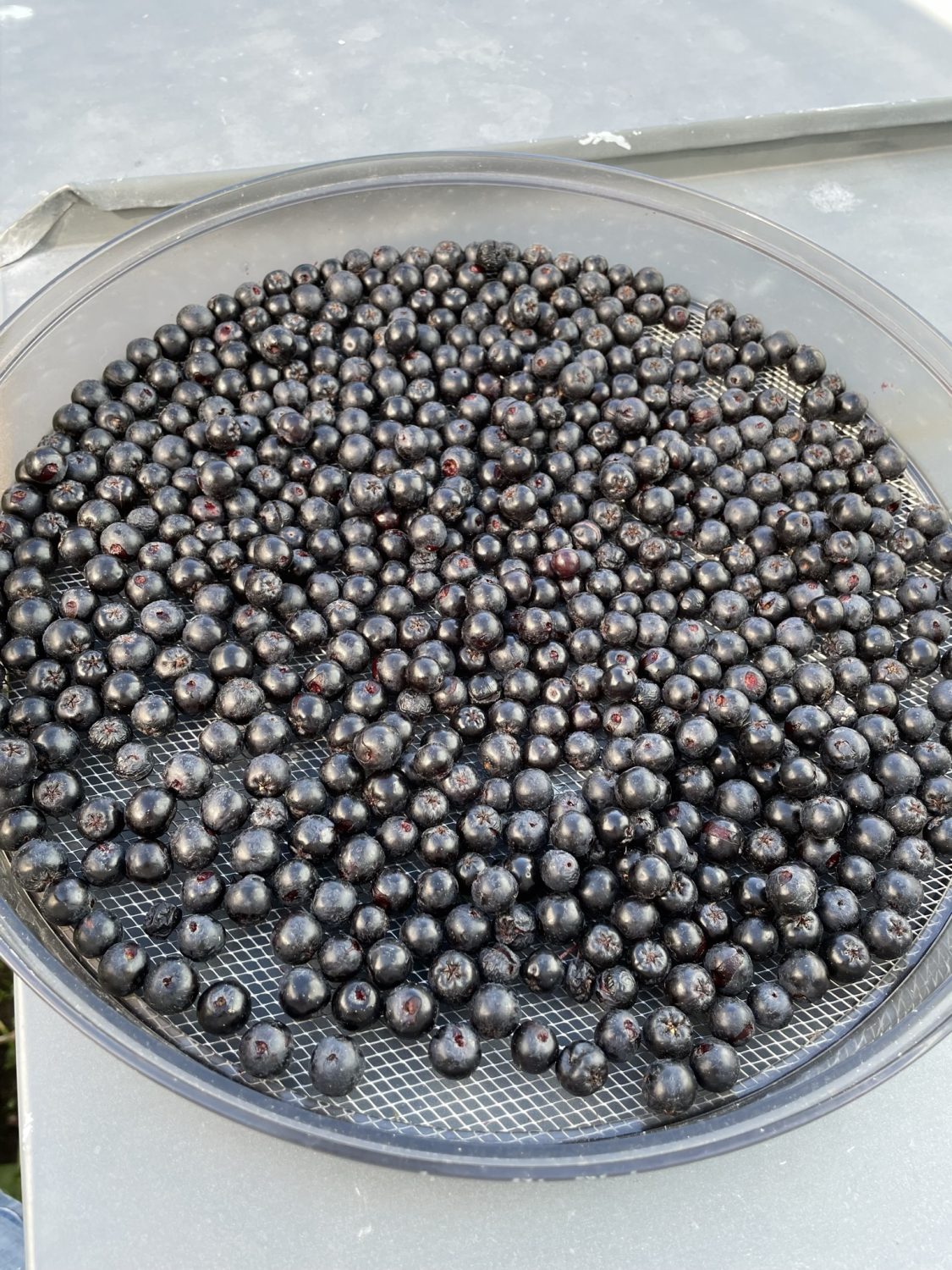 Dieses Jahr – im 5. Standjahr – ist der inzwischen recht stattliche Busch so voll mit den schwarzen Beeren, dass ich mal wieder eine Schüssel voll von den kleinen, schwarzen Äpfelchen ernten kann.