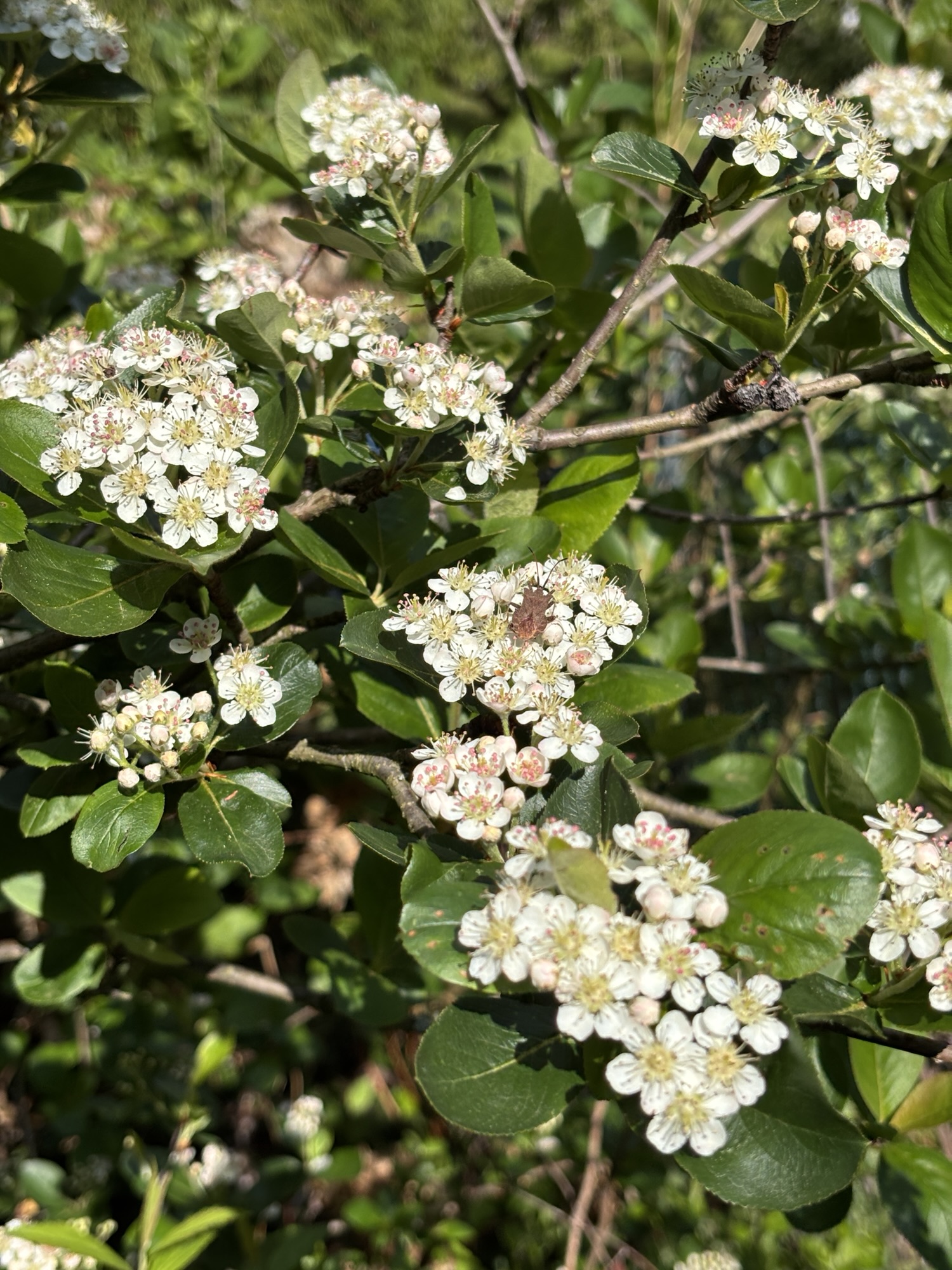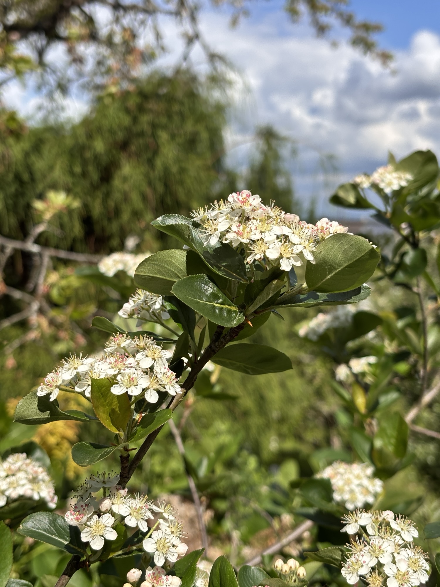 Meist gegen Ende April blüht der inzwischen stattliche Busch. Dann liegt ein süßlicher Duft in der Luft rund um die kleinen Dolden von 20-30 Blüten. Der ganze Busch summt und brummt. Das ist so schön anzusehen.