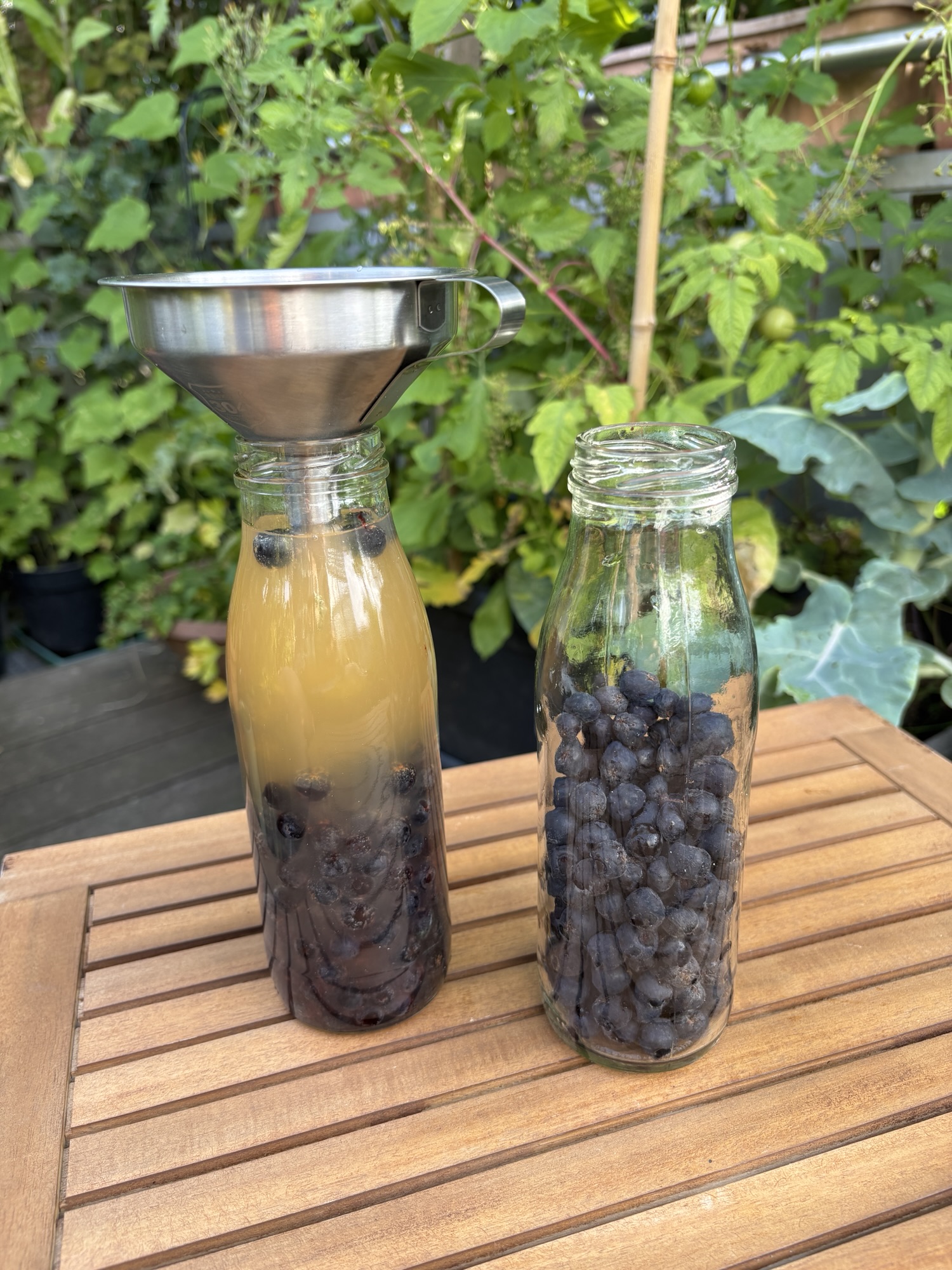 Rund eine Hand voll der Apfelbeeren je 500 ml Flasche setzte ich mit meinem selbst gemachten Apfelessig an. Sind die Beeren zumindest teilvweise getrocknet im Vorfeld, können sie im Essig verbleiben. Mindestens 4 Wochen sollte der Ansatz stehen, damit sich der Geschmack entwickeln. Daraus wird ein fruchtiger Essig, der sehr gut zum Feldsalat im Winter passt.