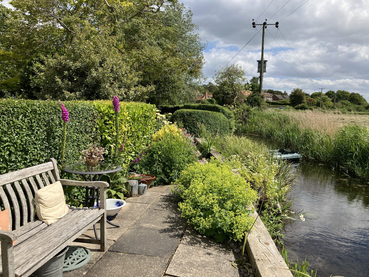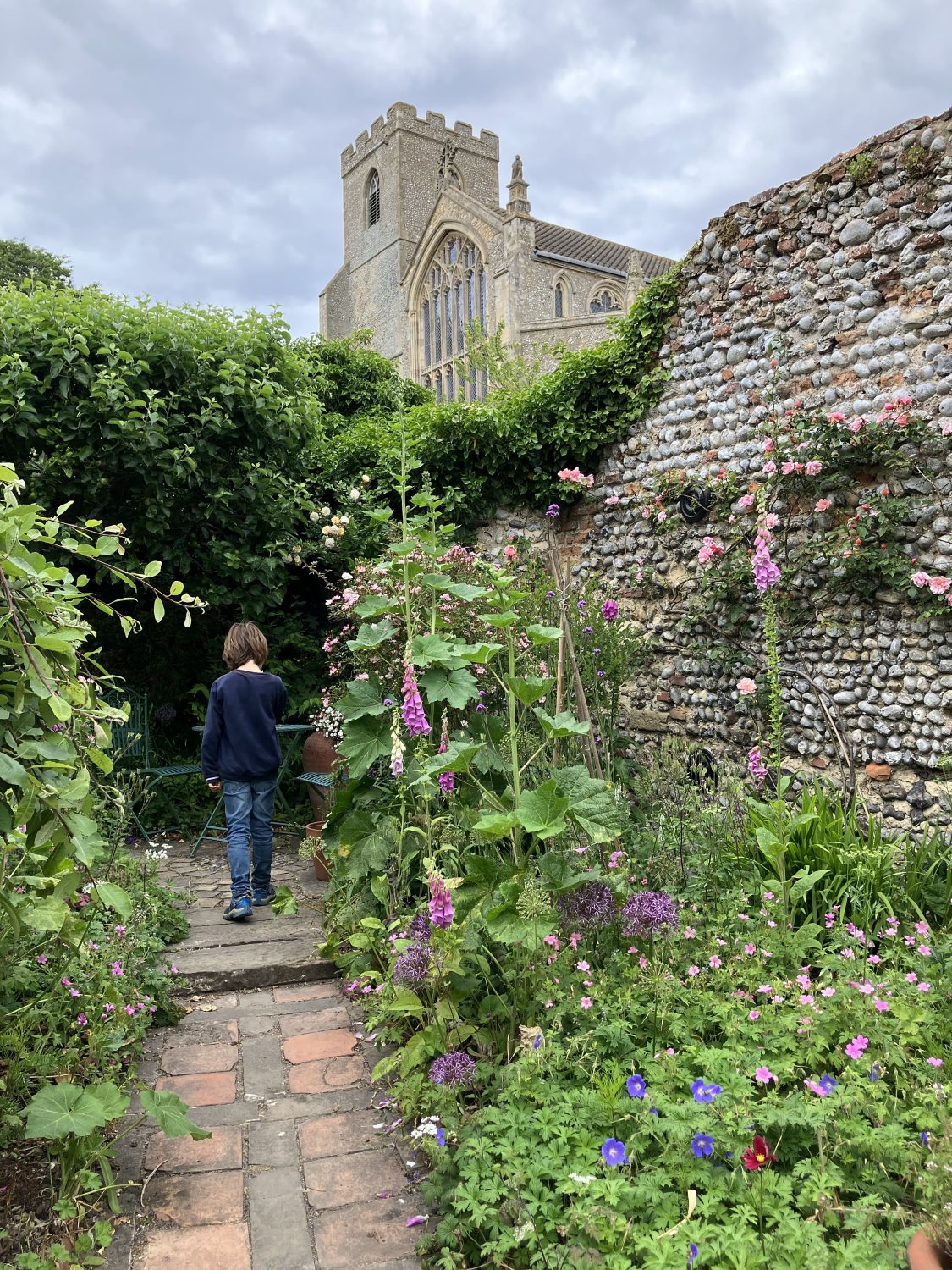 Nun aber zum Tag der offenen Gärten in „Cley next the Sea“, Norfolk. Dieses pitoreske Küstenörtchen liegt an einer Nordsee Marschlandschaft. Die Marsch ist mit natürlichen Kanälen durchzogen, welche zweimal am Tag trocken fallen. Bis zur offenen See sind es knapp 3 km vom Harbour/Hafen. Trotzdem bestimmt das Meer die Szeneri in und um die Gärten der alten Steinhäuser. Cley next the Sea ist inzwischen ein Touristenörtchen. Einheimische wohnen hier nur noch wenige. Dafür viele englische Ruheständler mit Geld.