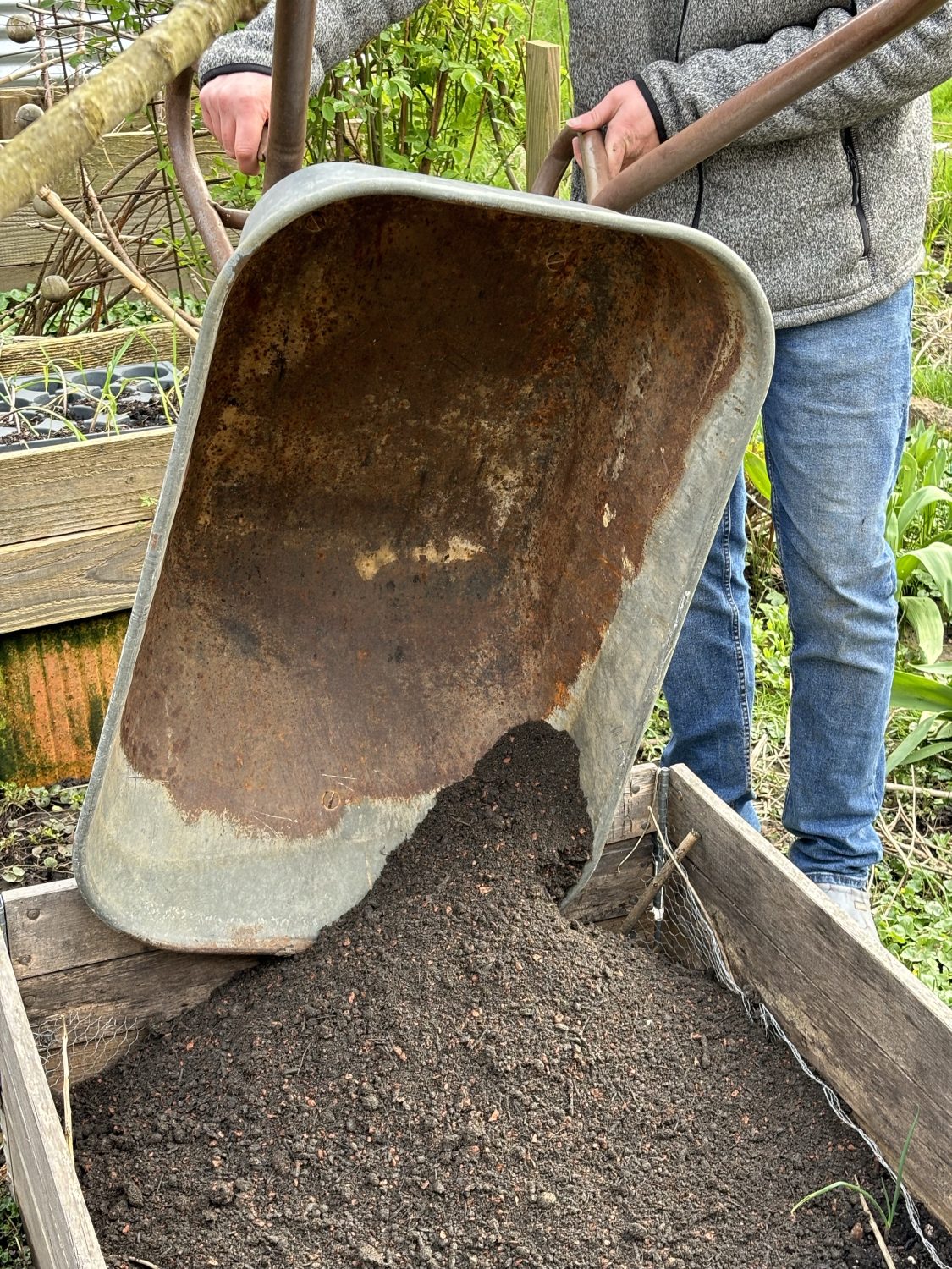 Das Gleiche mach ich mit den Gemüsebeeten im oberen Hausgarten. Unkraut und alten Bewuchs raus, Schwarzerde oben auf und gut wässern.