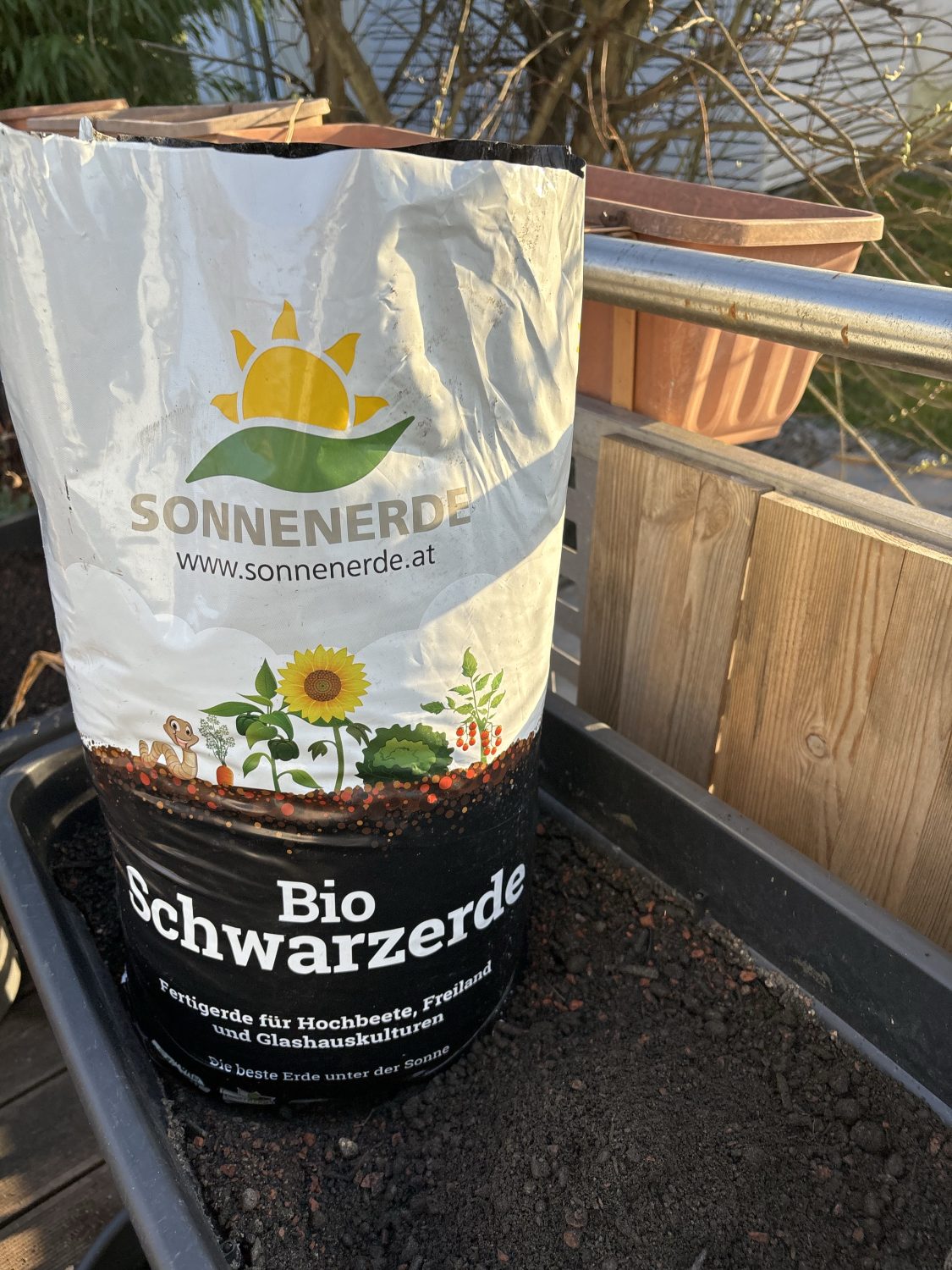 In den „alten“ Hochbeeten bringe ich 15 – 20 cm Schwarzerde ein. Vorher alles Unkraut entfernen, dann die Schwarzerde einfach auf die alte Erde oben aufschütten. Gut wässern, damit sie die Schwarzerde mit Feuchtigkeit vollsaugen kann.