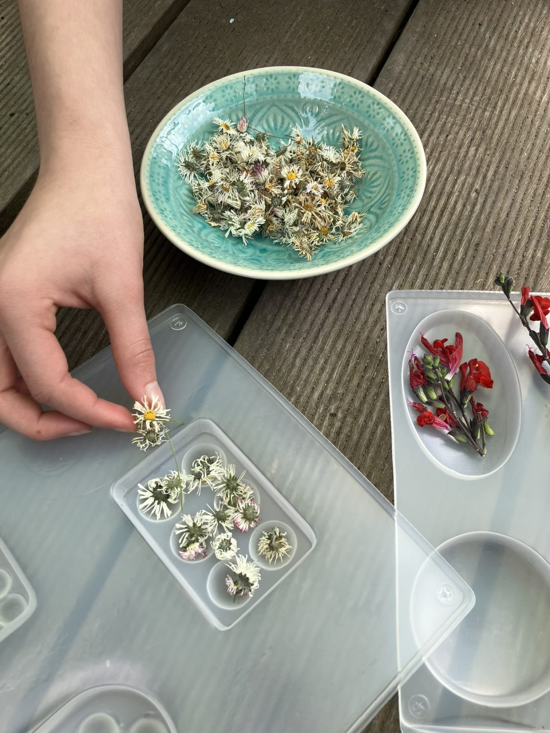 - Mit Blütenblätter verzieren und mindestens 2 Wochen trocknen lassen vor dem Verwenden. Besser länger.