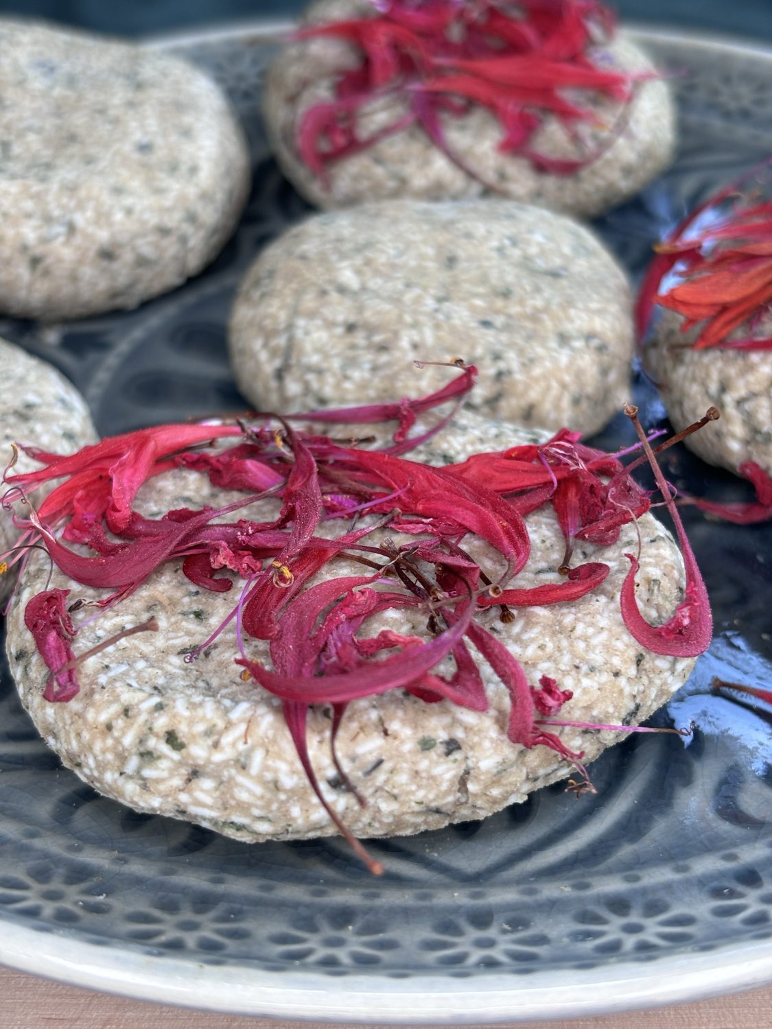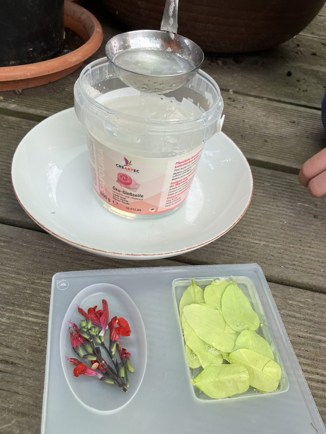 Die verwendetem Blüten und Kräuter sind absolut Giftfrei – da bin ich mir sicher. Sie stammen ausnahmslos aus dem eigenen Garten. Die Gänseblümchen und die Blüten der Fruchtsalbei Sorte Salvia microphylla ‚Royal Bumble‘ habe ich etwas antrocknen lassen. Die Blätter der Kaffirlimette kommen frisch in die Seife.