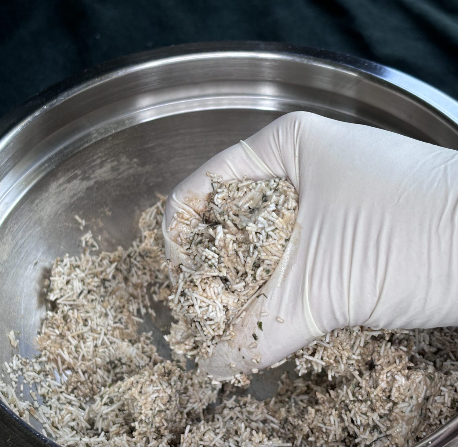 - Zuerst die trockenen Zutaten -Heilerde und gemahlener Waldmeister - unter die Knetseife vermengen.