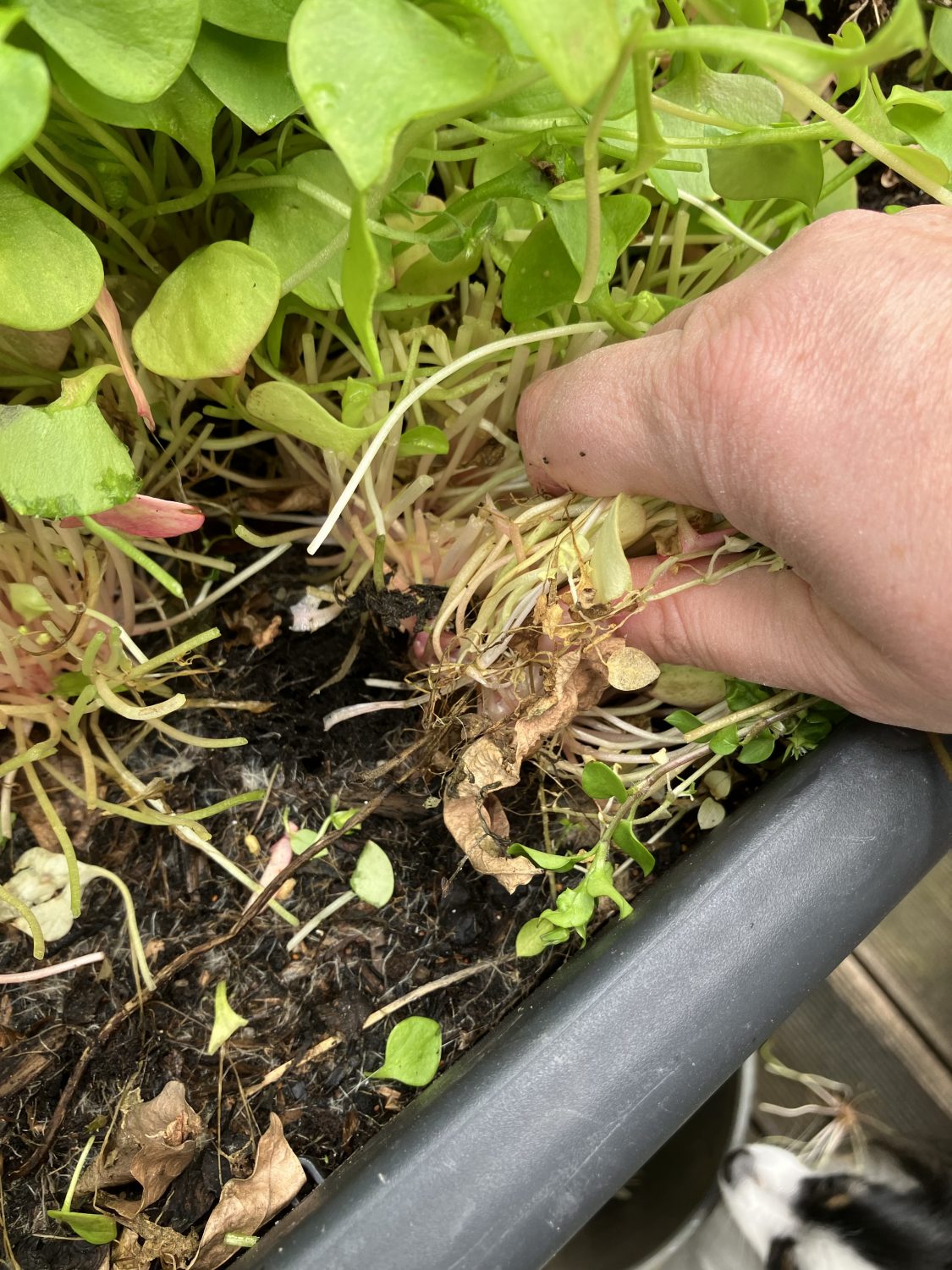 Die drei geretten Würzelchen hatte ich in einer Ecke des Hochbeetes im Balkongarten gelegt – und mal wieder vergessen. Daraufhin hat mir die Natur und meine ewige Vergesslichkeit gezeigt, wie es am besten geht. Einfach mal wachsen lassen. Nun muss ich aufpassen, dass nicht alles überwuchert wird vom Tobi.