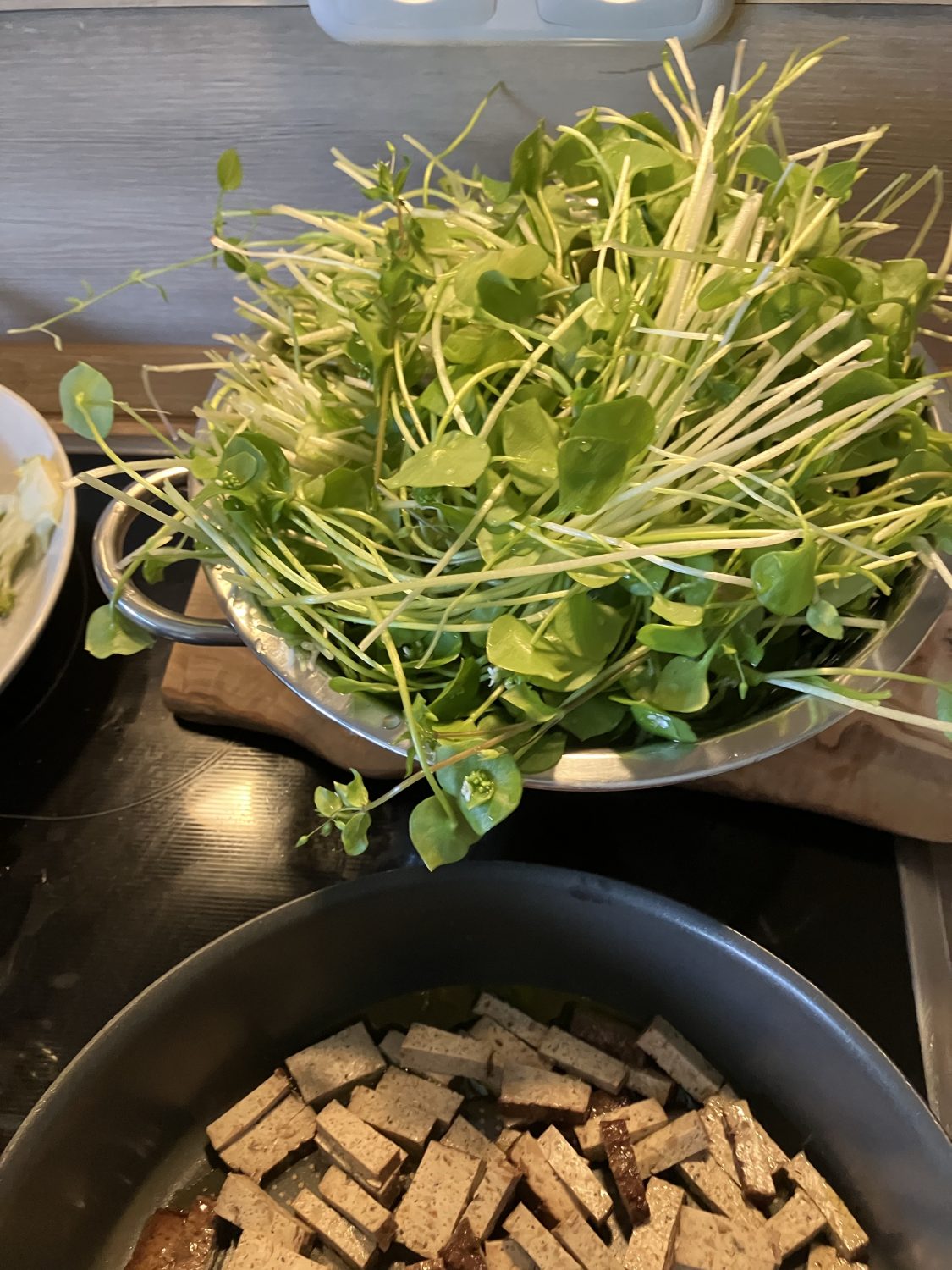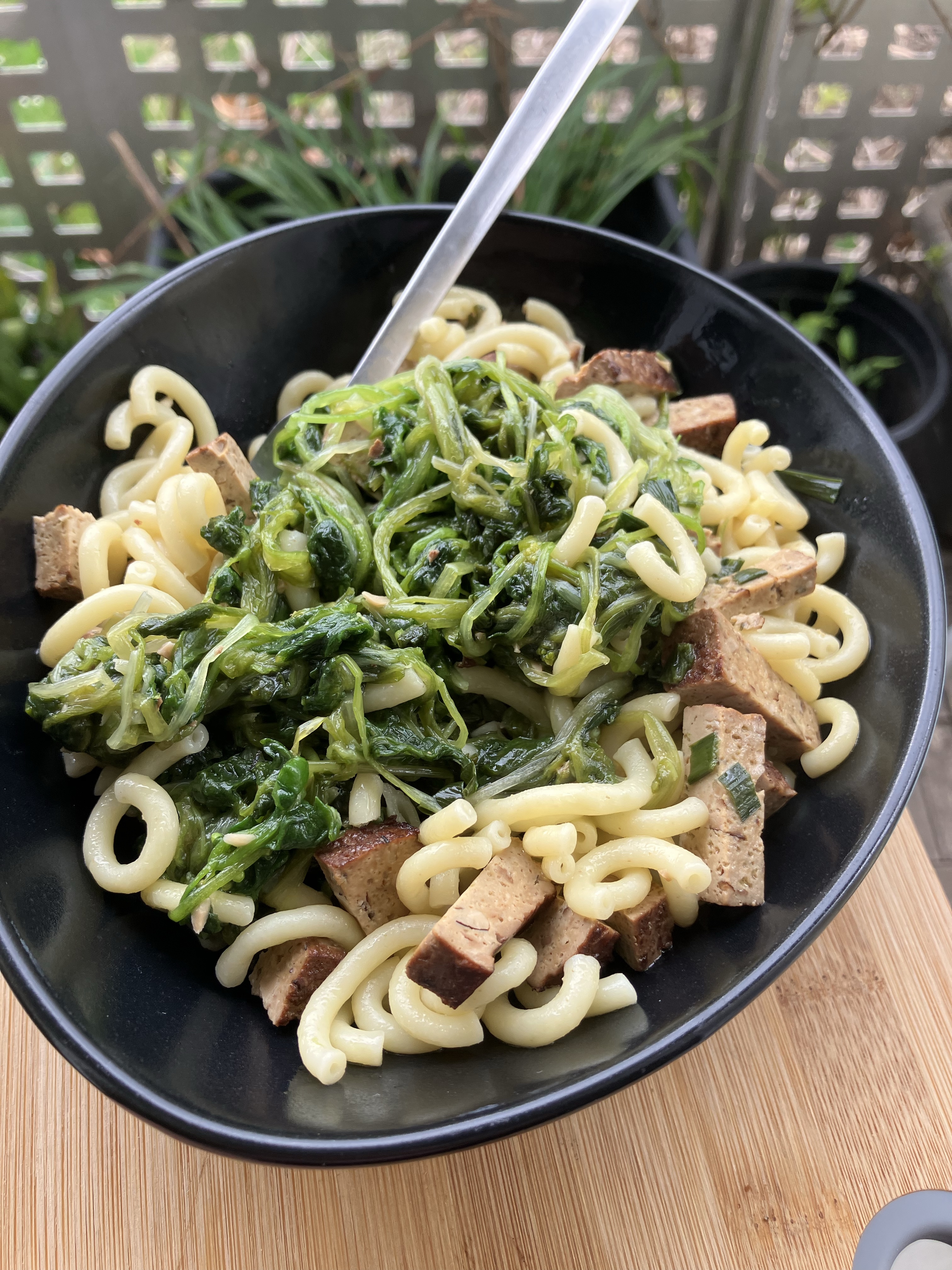 - Tofu klein schneiden und in Olivenöl, zusammen mit den Knoblauch-/Gras anbraten.