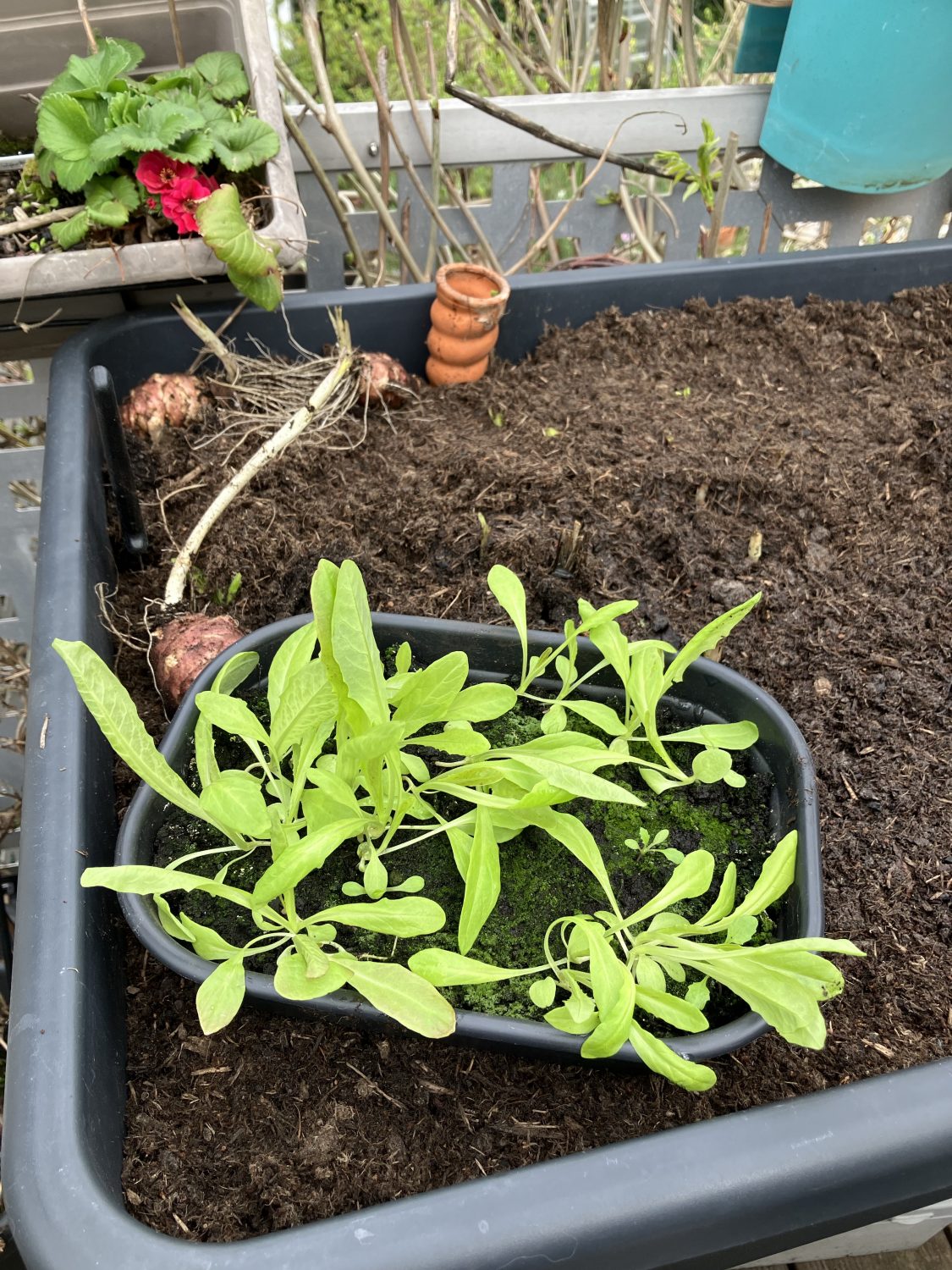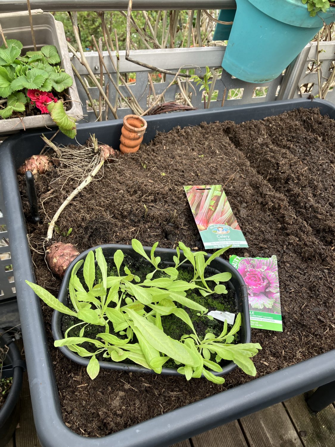 Aus dem Gewächshaus Schrank hole ich kleine, selbst gezogene Salatsetzlinge. Die pflanze ich in die gut angefeuchtete Pflanzerde. Daneben säe ich noch zwei bunte Gemüse Varianten aus. Den „Button Hole Kale Starmaker“ und den Stangensellerie „Giant Red“. Beide Saatgut Tütchen lagen in einer Garten Zeitschrift aus Englad bei.