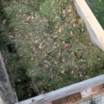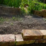 Aufbau eines Hochbeetes. Der engmaschige Kleintierdraht hält hoffentlich die Nagern fern. Das erste Schnittgut zieht ein bevor der Holzaufbau einfach auf die Ziegelsteine gesetzt wird. Es folgt eine dicke Schicht frischer Rasenschnitt.