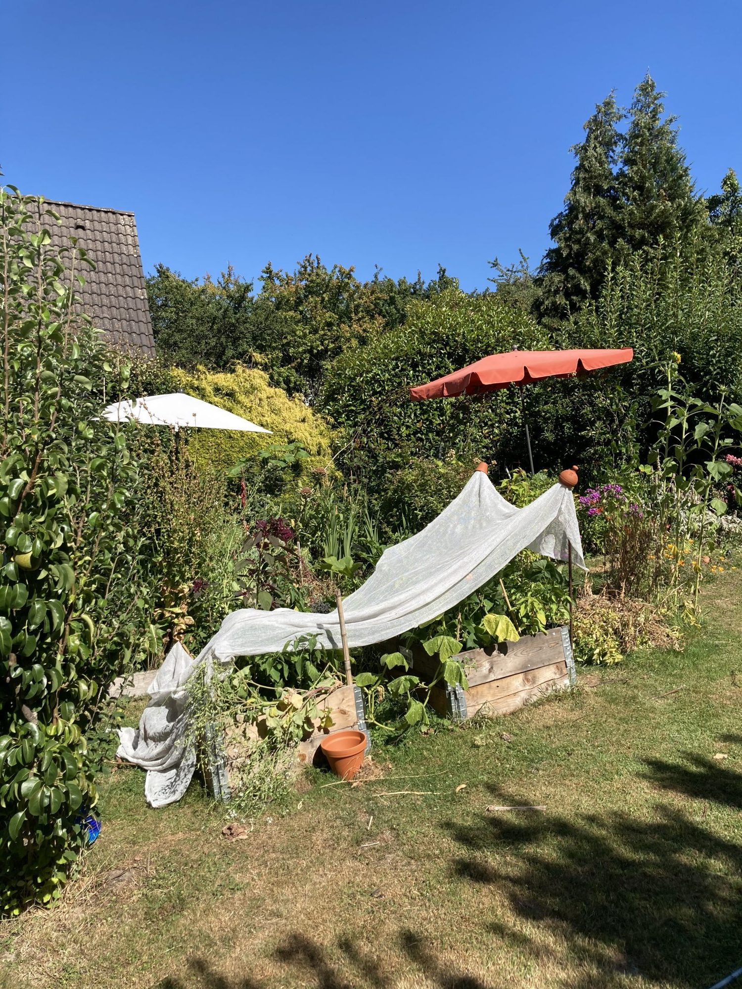 Leider ist der Standort dieser Hochbeete viel zu warm für meine geliebten Kohlpflanzen, besonders im Hochsommer. Dann ist dieser Ort im Garten den ganzen Tag vollsonnig. Kopfkohlsorten fangen hier immer an zu schießen. Rosenkohl und Palmkohl mückern vor sich hin.