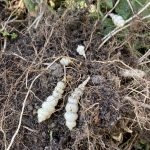 Jetzt im Oktober muss der Knoblauch gesteckt werden. Er kommt bei mir in diesem Jahr in ein Hochbeet, in dem Karotten gewachsen sind. Beim Aufräumen des Hochbeetes finden sich immer wieder kleine, weiße „Maden“. Das sind die verdickten Wurzel des Knollenziest Crosne (Stachys sieboldii). Der hat sich hier auch breit gemacht und die Karotten fast verdrängt.