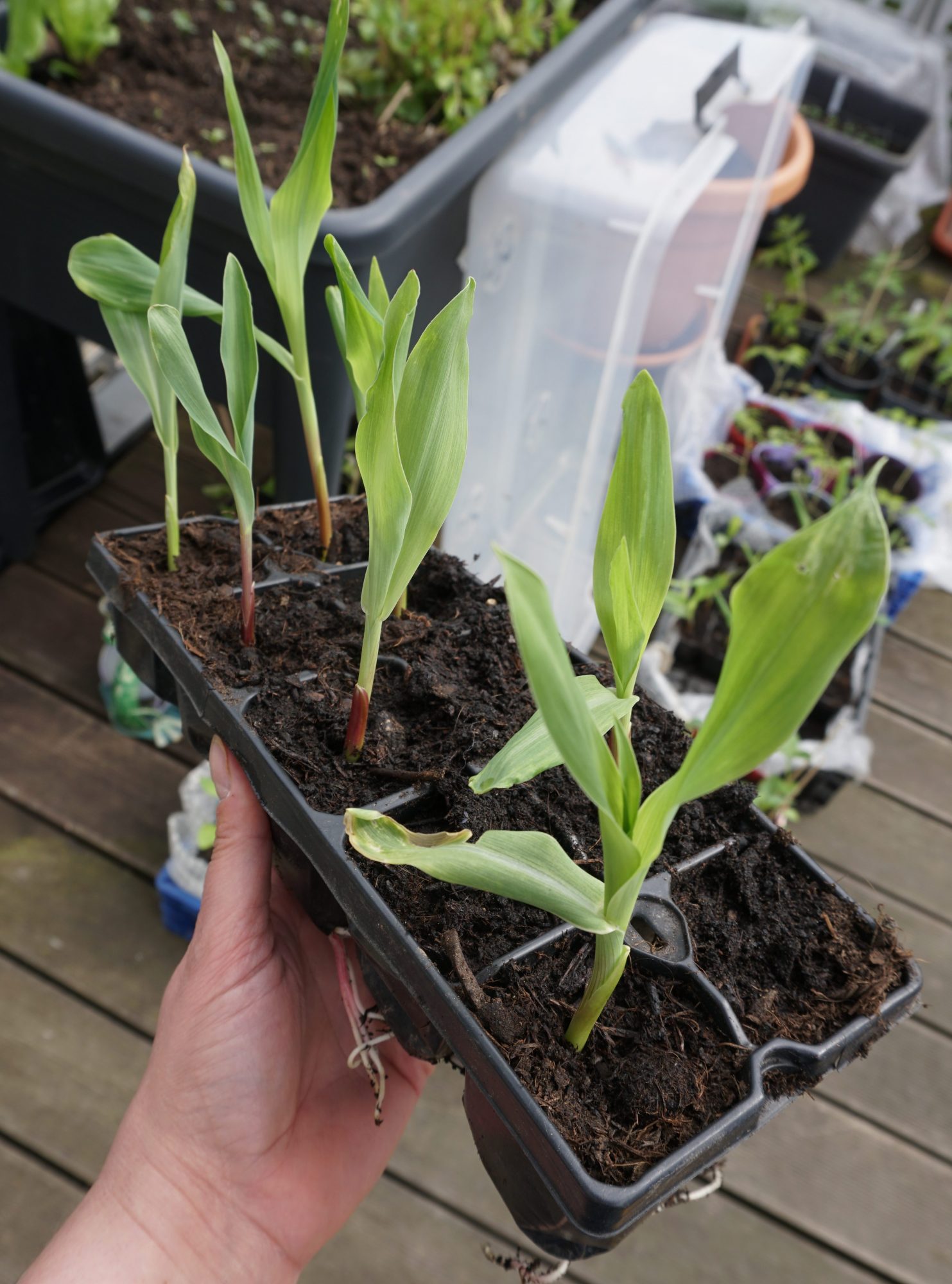 Wenn die Keimlinge den Deckel der Box erreichen, kommen sie in Pflanztöpfe. Oder sie werden bereits direkt in ein Beet gepflanzt. Weiterer großer Vorteil: Die „tauben“ Maiskörner werden einfach entsorgt. Die Keimrate von Mais ist selten höher als 70%. So werden die Pflanztöpfe oder der Platz im Beet optimal genutzt.