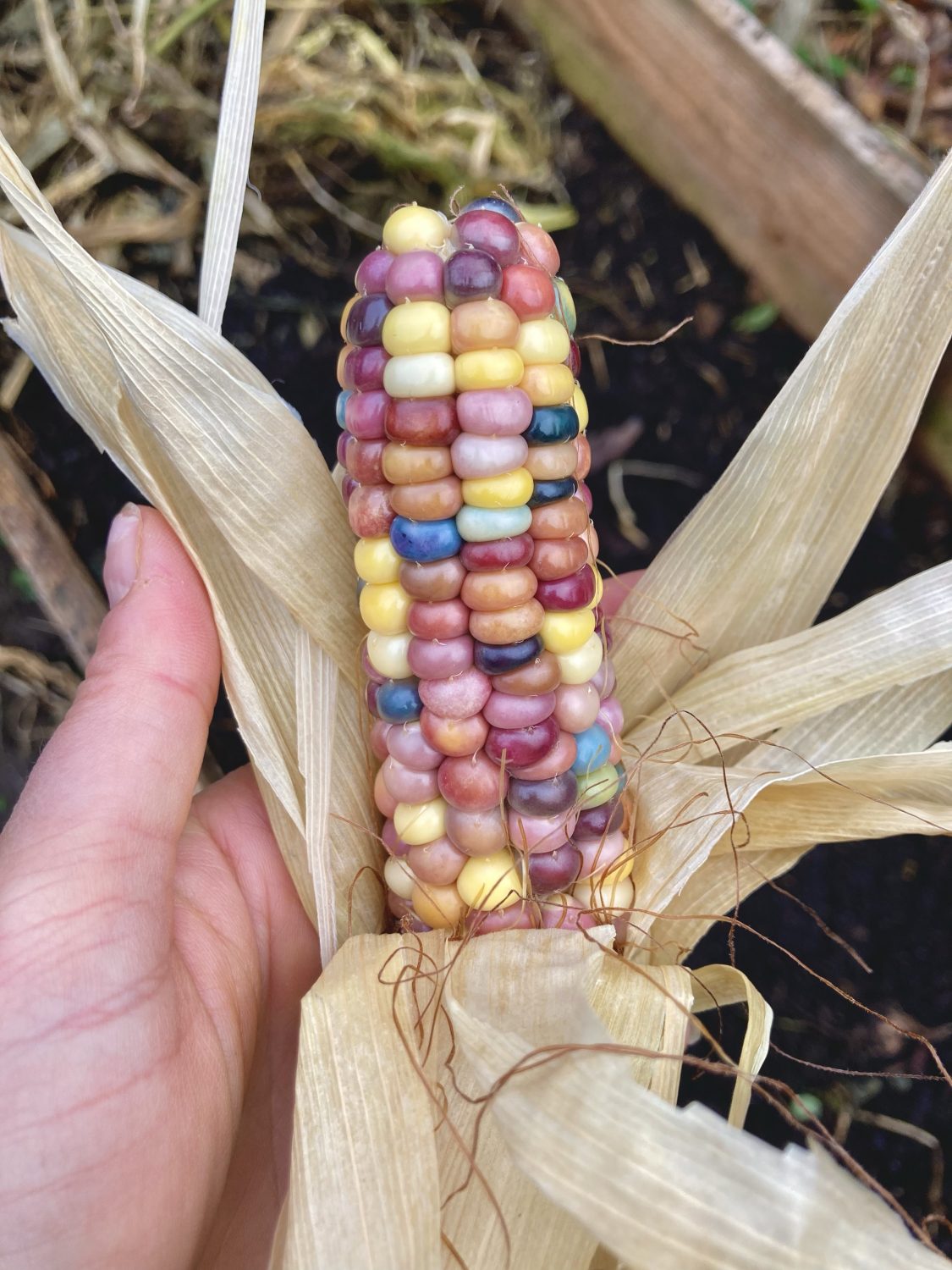 Auch beim Popcorn gibt es hochwachsende Sorten, wie der bunte „Glass Gem“. Hochwachsende Mais Sorten sollten nur im Beet gezogen werden. Mais ist ein sogenannter Tiefwurzler. Die Pfahlwurzel der hochwachsenden Sorten kann bis zu 2,5 m tief wurzeln! Darauf bei der Sortenwahl für den Anbau in eurem Balkon-/ Garten unbedingt achten, bevor ihr eure Wahl trefft.