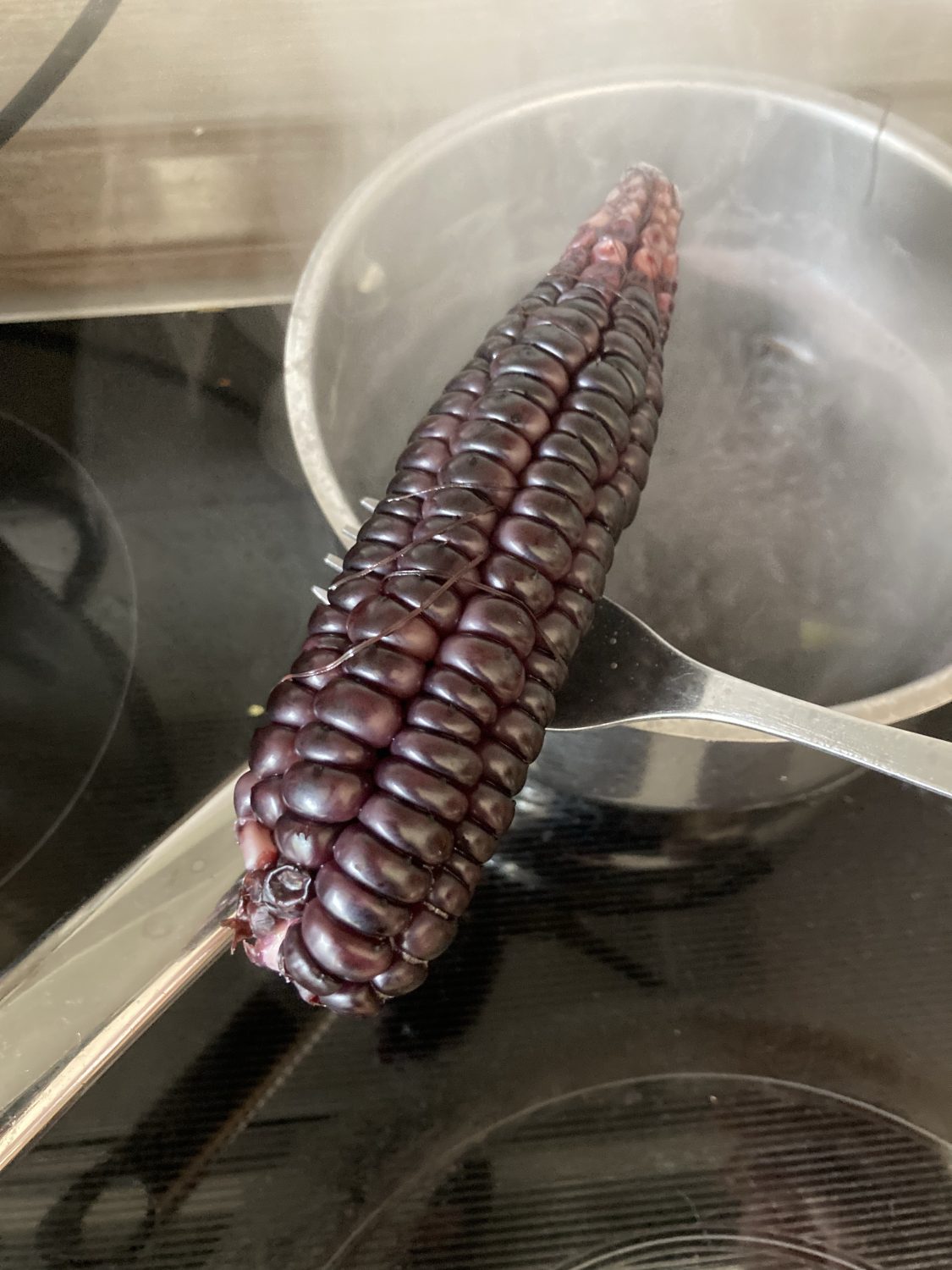 Mais in der größten Hitze Anfang Juni zu setzen war definitiv zu spät. Die Erde war bereits stark ausgegetrocknet, der Mais konnte nicht mehr richtig wurzeln. Ensprechend schlecht war daher der Ernteertrag. Immerhin konnte ich ein paar Kolben mit leckeren, schwarzen Maiz Körnern ernten. Man lernt nie aus, nächstes Mal mache ich es besser.