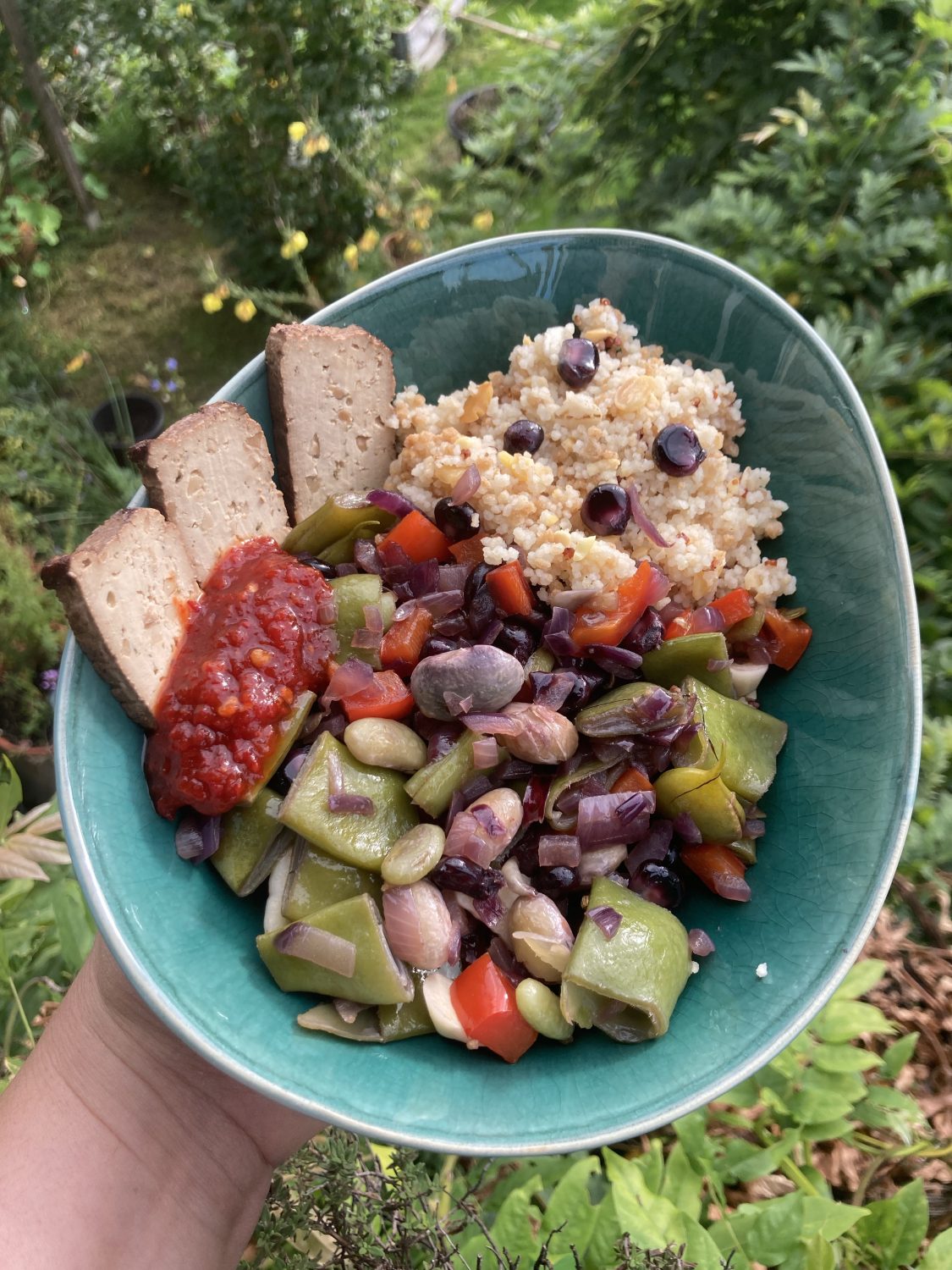 Die Stangenbohnen können an den Maispflanzen hochklettern. Der Starkzehrere Mais wird mit Stickstoff versorgt, welche die Bohnen mit ihren Knöllchenbakterien an den Wurzeln im Boden binden. Der Kürbis hat ein schattiges Plätzchen und mulcht gleichzeitig den Boden. Das schützt den Boden vor dem Austrocknen und unterdrückt aufkommendes Unkraut.