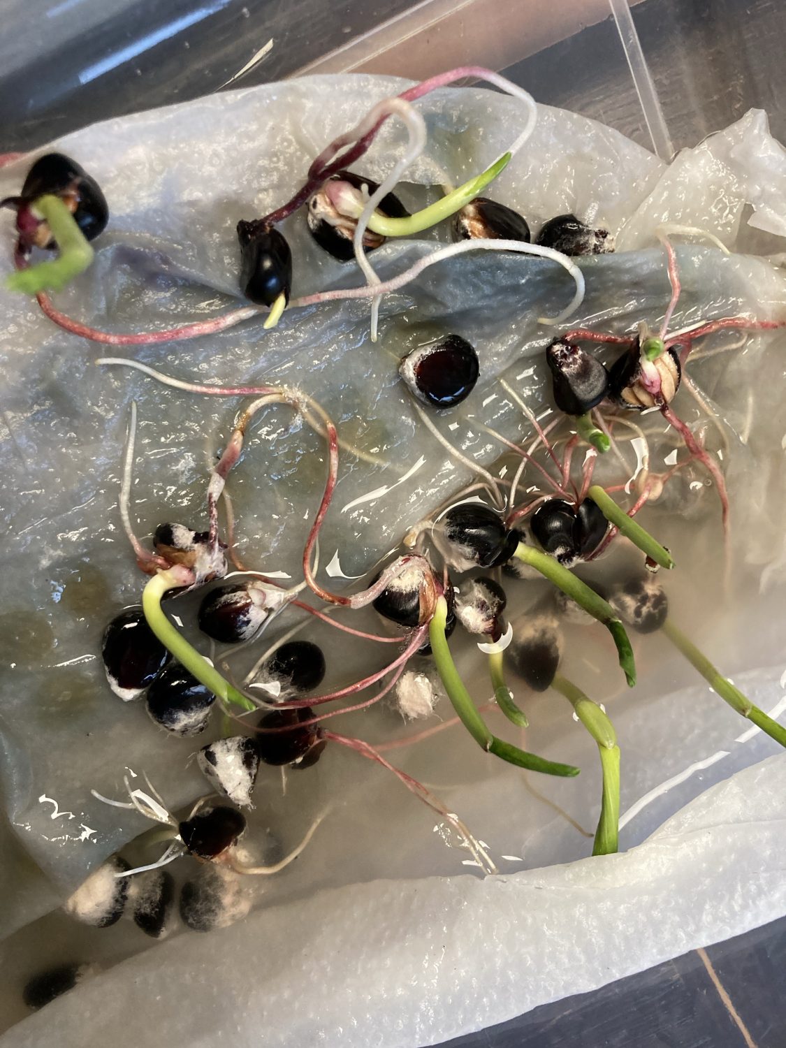Eine weitere Anzucht Methode hat sich auch als sehr erfolgreich bei der Mais Aussaat heraus gestellt. Dazu wässere ich die Maiskörner zuerst für eine Nacht. Danach kommen sie in eine durchsichtige Plastikbox mit Deckel. Auf einem feuchten Küchenkrepp dürfen die Körner keimen. Das klappt überraschend gut. Wichtig ist, dass die Dose leicht geöffnet bleibt und regelmäßig gelüftet wird. Die Körner könnten anonsten anfangen zu schimmeln.