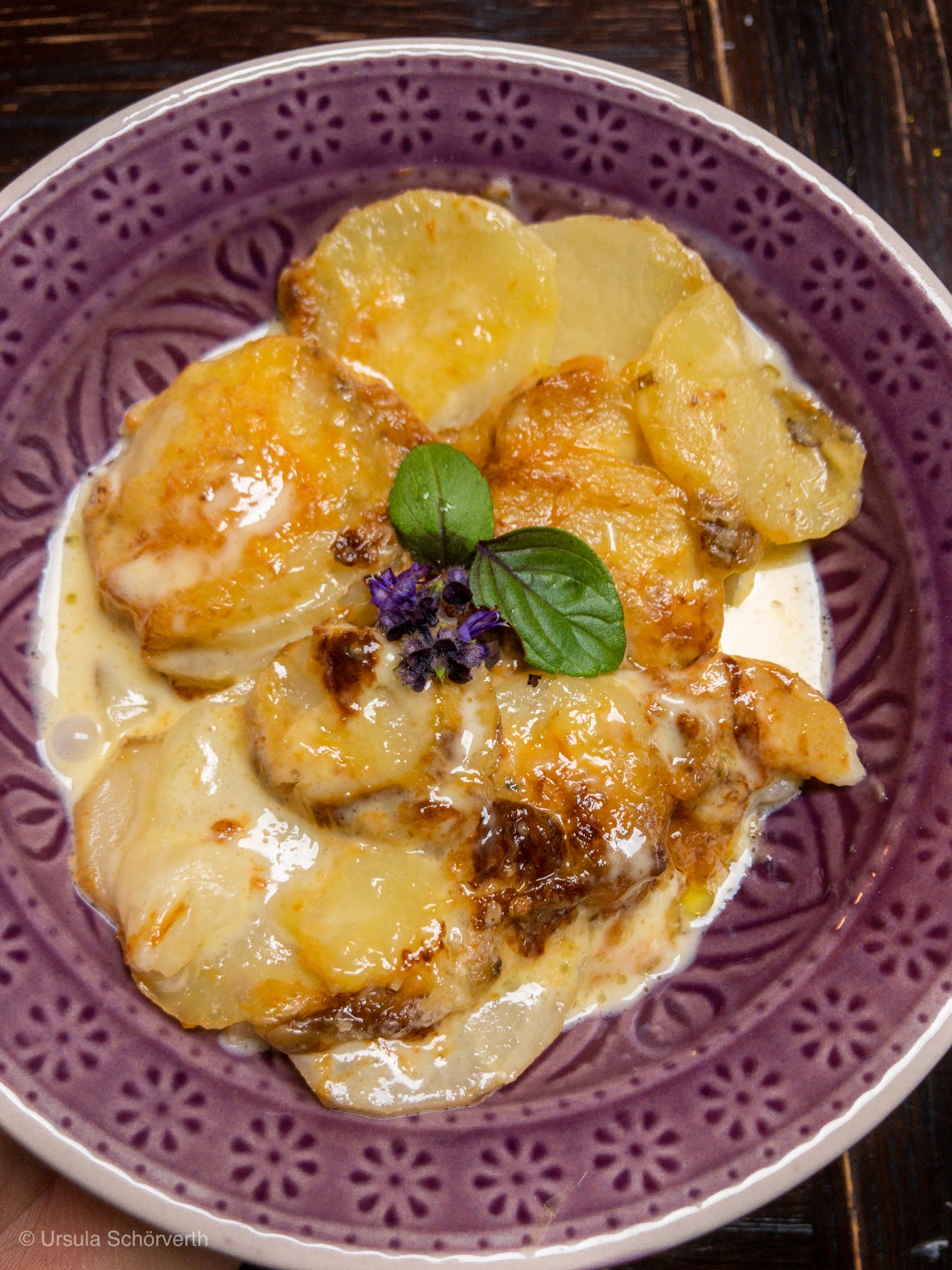 - Bei 160° C in den Ofen geben. Nach 30 Minuten sind die Scheiben weich. Dazwischen das Gratin entweder einmal unterheben, damit die oberste Schicht nicht verbrennt. Oder die ersten 20 Minuten abdecken mit Backpapier.