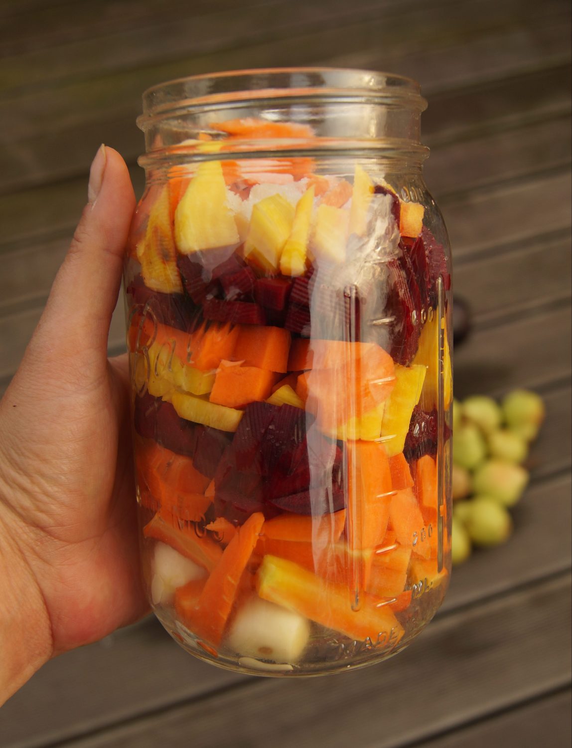 Ganz besonders das Glas oder Jar, Gärdeckel und Gewicht sollten sterilisiert sein. Die Karotten gewaschen und geschält. Als Variation können auch Beete mit ins Glas, je nach Geschmack. Übrigens färben die rote Beete wirklich ALLES rot.