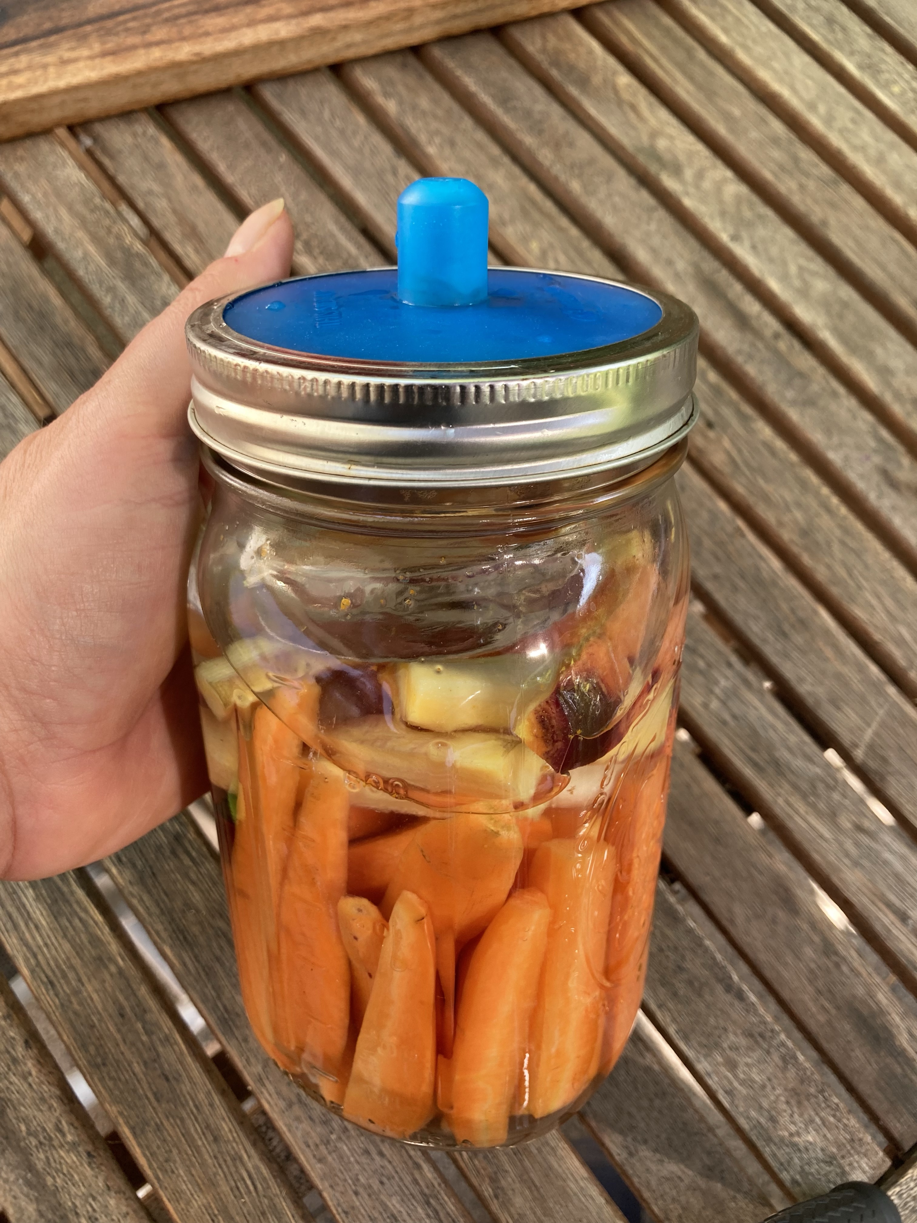 Bei der heutige Ernte waren auch eine gelbe und eine rote Beete mit dabei. Zusammen mit den übrig gebliebenen Karotten – die anderen wurden bereits quasi vor Ort verspeist – starte ich mal wieder einen Fermentations Experiment. Ich habe mir letztes Jahr zwei Deckel Modelle zur Fermentation und die entsprechenden Gläsern aus den USA gegönnt. Bisher konnte ich nur eines der Systeme wirklich testen, das mit den Pickle Pipes aus Silikon. Damit habe ich auch gute Erfahrungen gemacht, beim Fermentieren von sauren Schnippelbohnen.