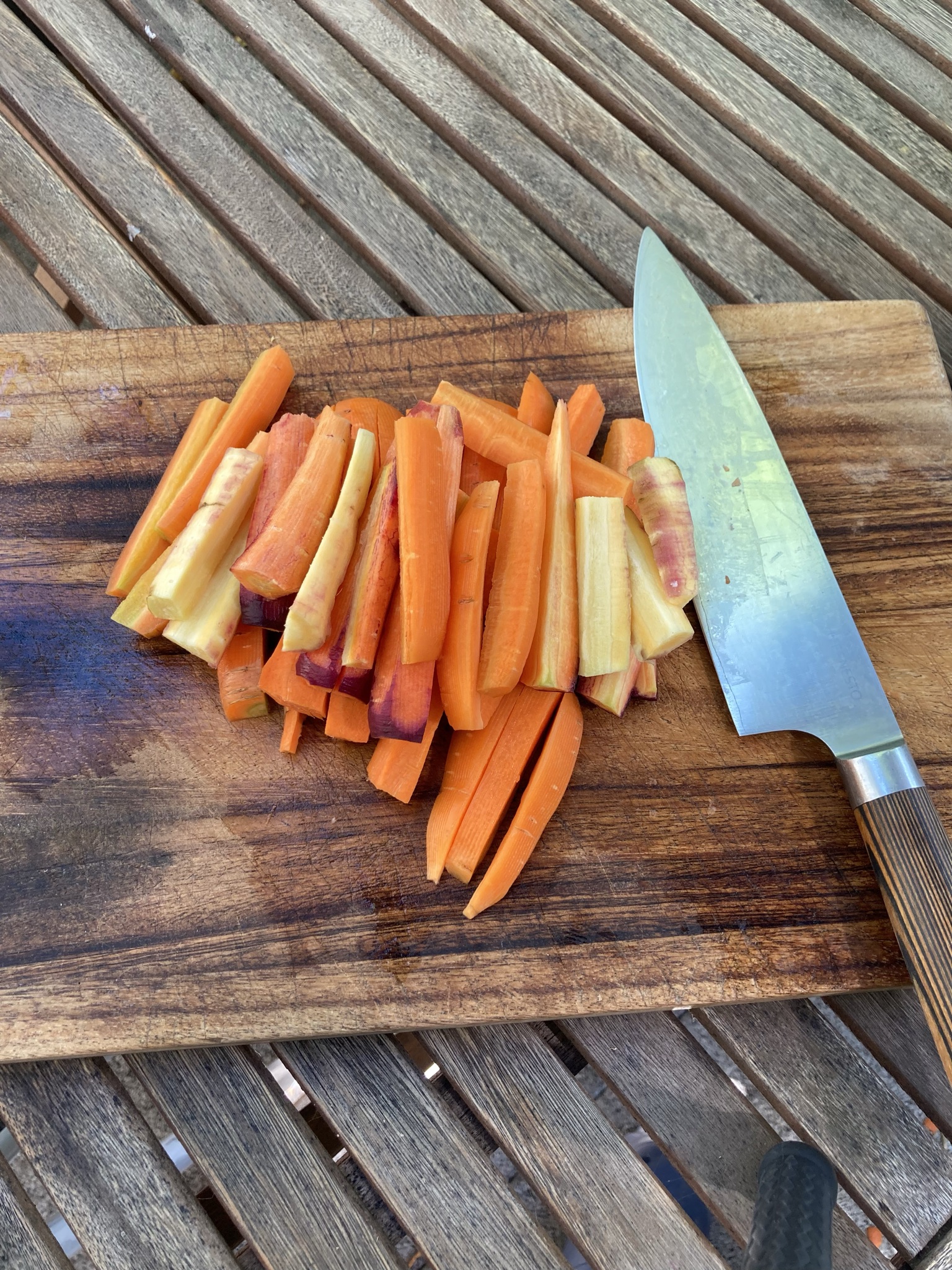 - Die Karotten werden in rund 7 cm lange Stifte geschnitten - sogenannte Chunks. Sie sollten zwischen 5 und 7 mm Kantenlänge an der Stirnseite haben für das beste Ergebnis. Es muss aber nicht exakt sein.