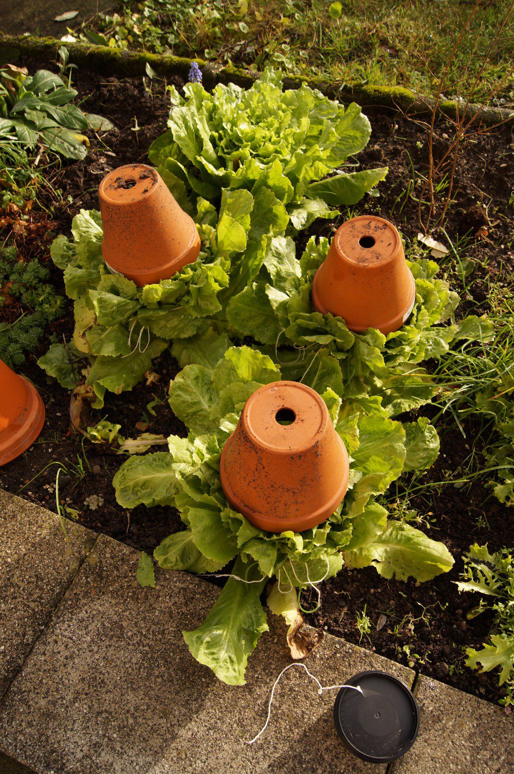 Im August habe ich hinter dem Haus sowohl gekaufte Setzlinge gepflanzt, als auch selber ausgesät. Die Ausgesäten sind recht mickrig geblieben, aber die Setzlinge haben sich super entwickelt. Bei meinen Recherchen habe ich dann gelesen, dass in Frankreich der helle Kern in der Mitte des Kopfes dadurch erzielt wird, dass Tonglocken für rund 10 Tage aufsetzt werden. Nun gibt es diese zugegeben schicken Glocken nicht hier bei uns so einfach zu kaufen.