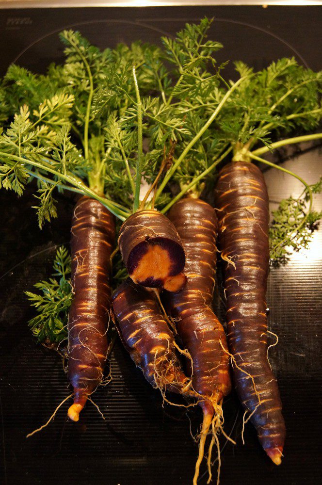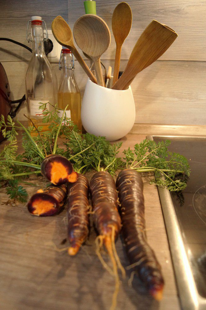 Als Belohnung habe ich mir noch 4 Purple Haze aus dem Boden geholt. Ja, dieser ungewöhnlich warme Winter hat definitiv seine Vorteile. Am Wochenende haben wir Mangold geerntet, gestern Endiviensalat und Rucola und heute die Möhren. Diese wirklich hübsche Sorte hat einen superleckeren Geschmack und soll eine Art Urmöhre sein. Wird auch dieses Jahr auf jeden Fall wieder in den Beeten gezogen. Die Samen sind von Kiepenkerl / Purpel Haze.