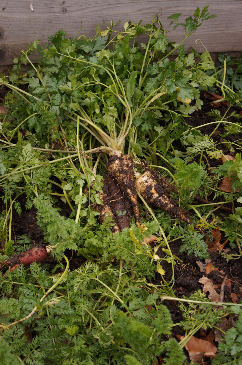 Durch den Verrotungsprozess, der sich in den unteren Lagen des Inhaltes abspielt, ist der Boden deutlich wärmer und das Gemüse kann früher ausgesät und länger geerntet werden. Hier sieht man Wurzelpetersilie, welche ich Gestern (30.01.) aus dem Boden gezogen habe. Spart einem die Lagerung. Im Boden hält sich das Gemüse einfach am längsten frisch.