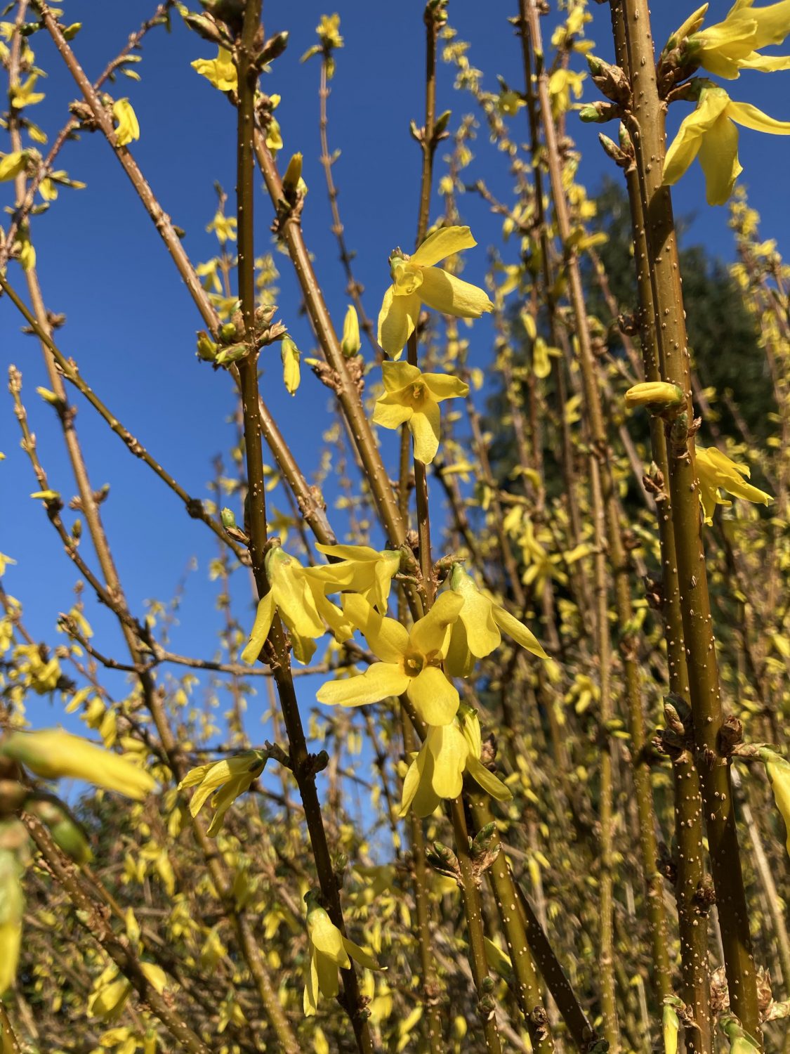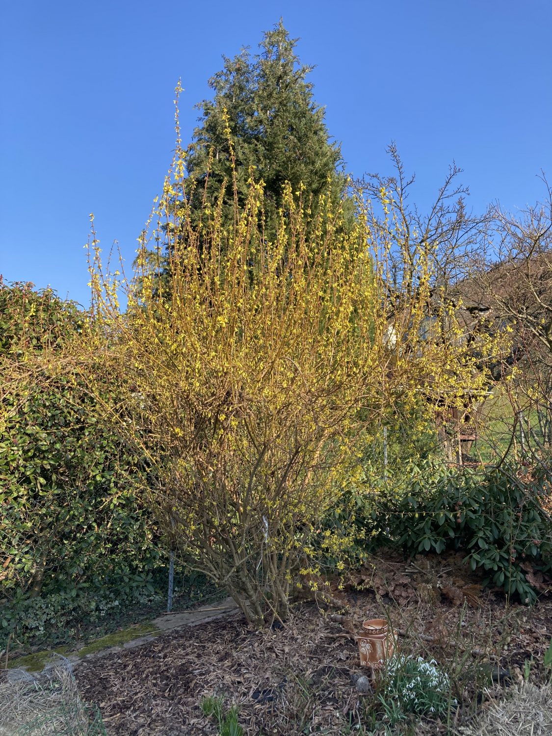 Ein Wermutstropfen: Leider sind die Blüten für die Insekten keine Nahrungsquelle. Die Hypride bilden weder Nektar noch Pollen. Deshalb würde ich keine Forsythie in den Garten pflanzen. Diese hier hat Bestandsschutz und darf auf jeden Fall bleiben. Schon alleine damit ich weiß, wann ich wieder die Schere in die Hand nehmen sollte. Aber auch, weil die Forsythie ein sehr beliebter Nistplatz für Vögel ist. Hier verirrt sich keine Vogelfressende Katze her.