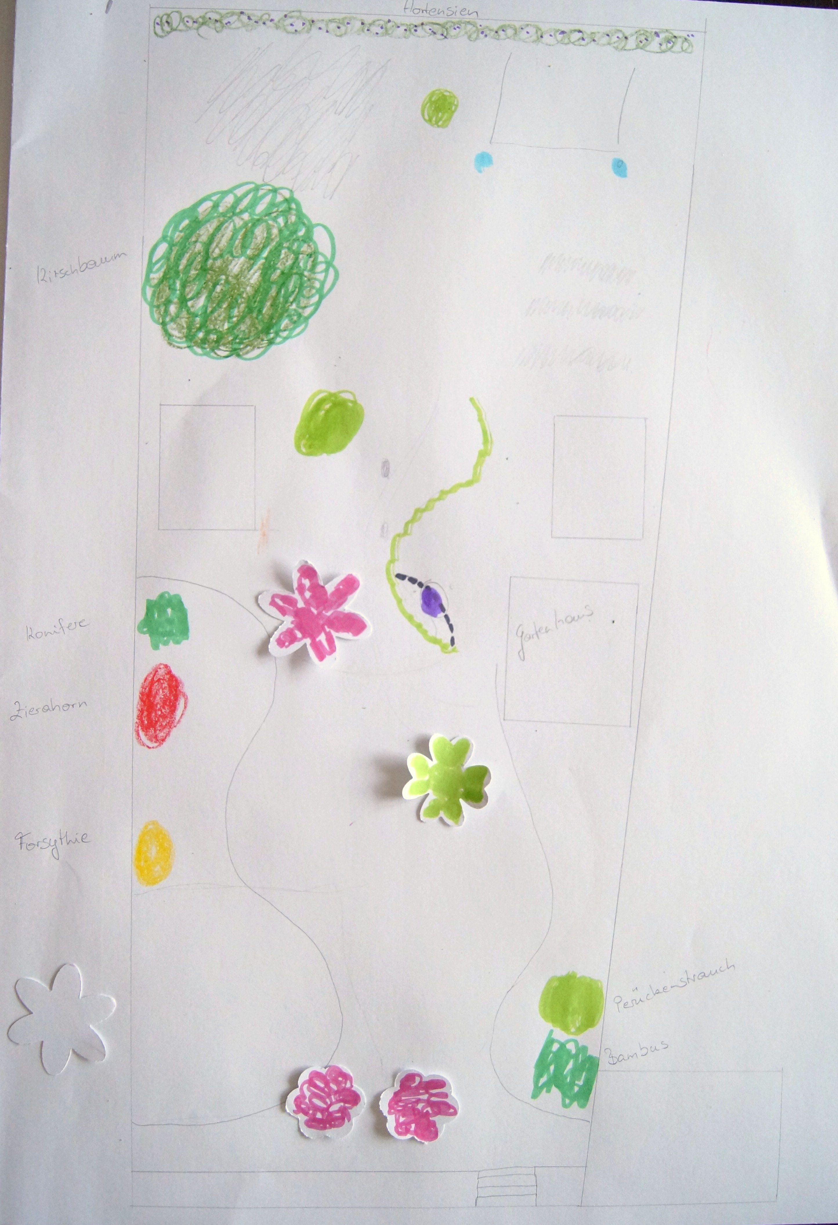 Wo mein Liebling hin soll, der Zierapfelbaum, weiß ich schon (das ist die große, rosane Papierblüte in der Bildmitte). Das grüne Kleeblatt ist die bereits gepflanzte Eberesche. Dieser Baum soll im Sommer hauptsächlich als Schattenspender für den Sandkasten dienen. Für mich hat er noch eine Funktion: Als Sichtschutz für den oberen Appartmentblock direkt an unserer Grundstücksgrenze.