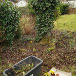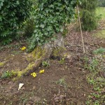 Zuerst in den Boden kommen die Winterlinge. Ihr Platz ist unter dem alten Kirschbaum. Nicht ganz einfach hier den richtigen Platz zu finden, denn im Sommer sitzt man sich gerne unter die weit herabhängenden Zweige. Bisher sind schattige Plätze im Garten ja eher selten. Also müssen die Winterlinge zwischen Wurzeln, die nicht genügend Platz zum hinsitzen lassen. Hier können sie sich dann hoffentlich in Ruhe vermehren. Bevor sie in den Boden kommen, habe ich noch einiges an Unkraut, vor allem Gundermann entfernt. Auch waren wieder einige Löwenzahnwurzeln dabei. Wirklich beeindruckend, wie groß diese Wurzeln werden können.