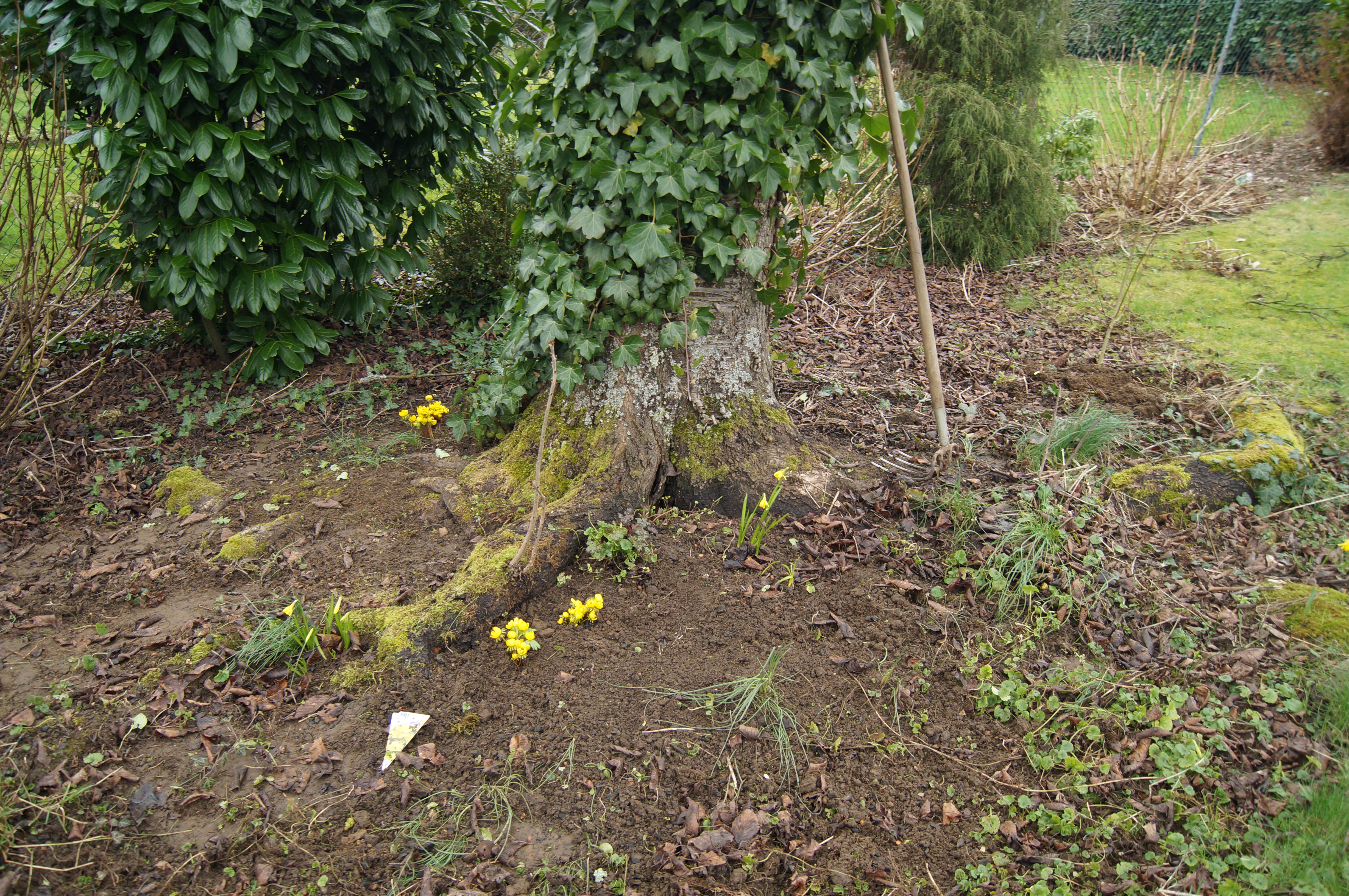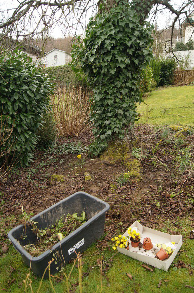 Zuerst in den Boden kommen die Winterlinge. Ihr Platz ist unter dem alten Kirschbaum. Nicht ganz einfach hier den richtigen Platz zu finden, denn im Sommer sitzt man sich gerne unter die weit herabhängenden Zweige. Bisher sind schattige Plätze im Garten ja eher selten. Also müssen die Winterlinge zwischen Wurzeln, die nicht genügend Platz zum hinsitzen lassen. Hier können sie sich dann hoffentlich in Ruhe vermehren. Bevor sie in den Boden kommen, habe ich noch einiges an Unkraut, vor allem Gundermann entfernt. Auch waren wieder einige Löwenzahnwurzeln dabei. Wirklich beeindruckend, wie groß diese Wurzeln werden können.