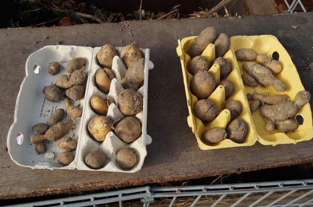 Beim umgraben haben sich noch einige der im letzten Jahr gewachsenen Kartoffeln aufgetan. Die sammle ich ein und lasse sie treiben. In rund 4 Wochen kommen sie dann wieder in die Erde. Am besten reifen die Saatkartoffeln vor in einem Eierkarton. Aufrecht hinein stellen und dann an einem hellen, trockenen Standort sprießen lassen. So kommen die Kartoffeln viel schneller auf den Teller.